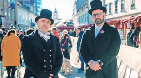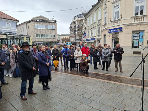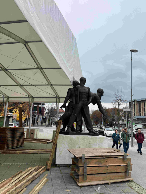 Maistrov trg, danes opoldne. Skoraj bi se zgodilo srečanje med županom Rakovcem in možnim izzivalcem na volitvah 2026 Iztokom Puričem. Pa se ni, ker je župan protokolarno vlogo prepustil podžupanji...