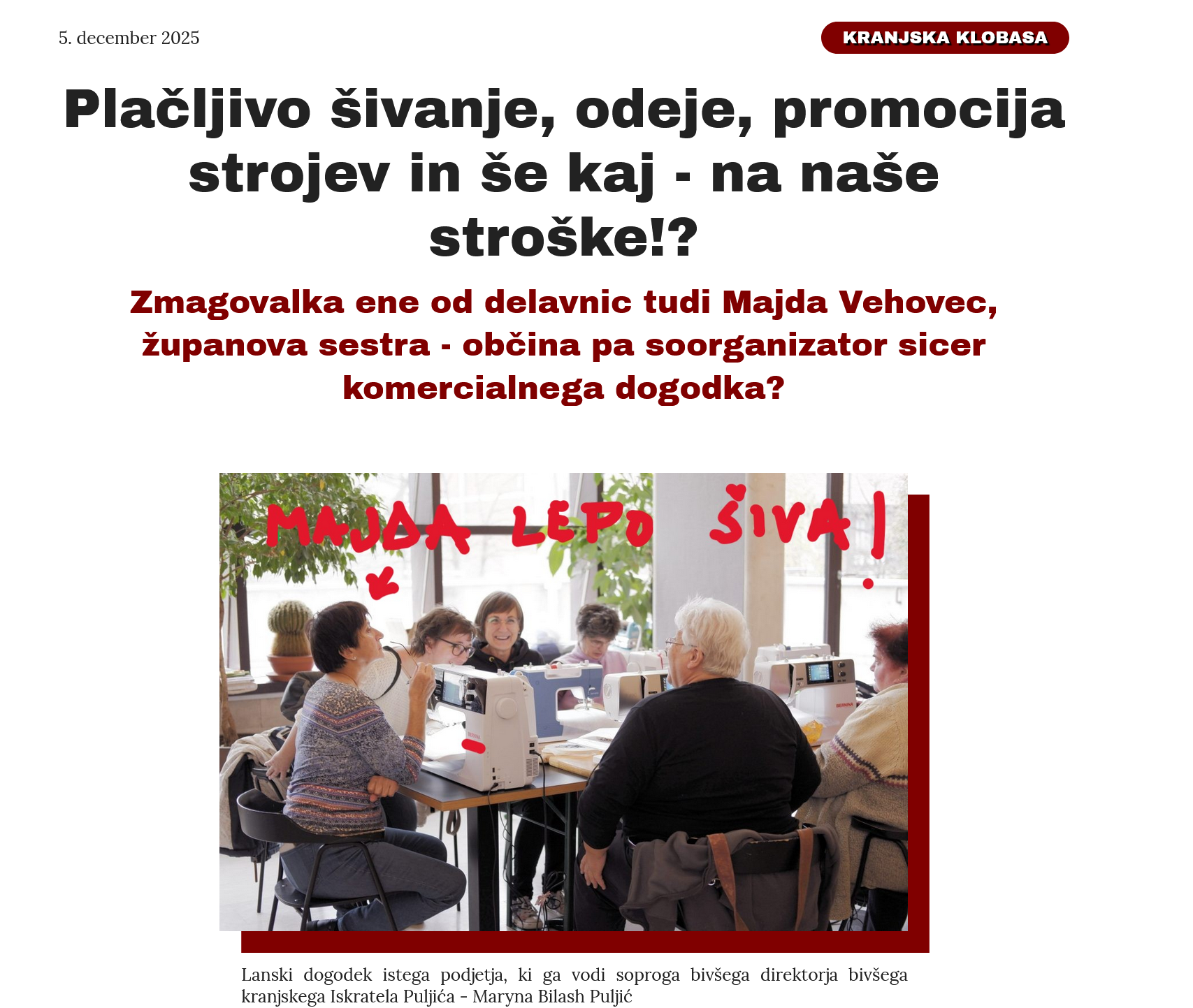 So naše objave ueperjene zoper koga ali za koga? Niti približno ne, Imamo pa neverjetno moč v naših virih - podatke o "navezi" smo namreč prejeli od bralca Trme. Objavljamo jih, ker je prav, da jim vemo vsi, ki plačujemo tako župana kot knjižnico kot direktorico in- kulturne dogodke s šiviljskimi stroji tudi! Volitve so novembra 2026!