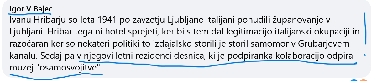 Pa še zanimiv odmev na to, da je od banke odkupljen objekt v lasti občine zanimiv zaradi Ivana Hribarja, slavnega in pomembnega župana Ljubljane, ki je ob okupatorjevi okupaciji skočil v Ljubljanico in končal svoje življenje kot res zaveden Slovenec! /vir splet/