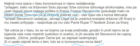 *ko sem o poslih podjetja, ki sodeluje v diplomski nalogi bivšega župana, vprašal MO Kranj (pisno vprašanje), me je poklical tisti, ki danes podpisuje peticije proti pritiskom in mi rekel, da "Dnevnik o tem ne bo pisal" - in ni. MO Kranj ni nikdar dala odgovora, jaz sem se pohlevno umaknil. Pol krivde za to svinjarijo je moje.