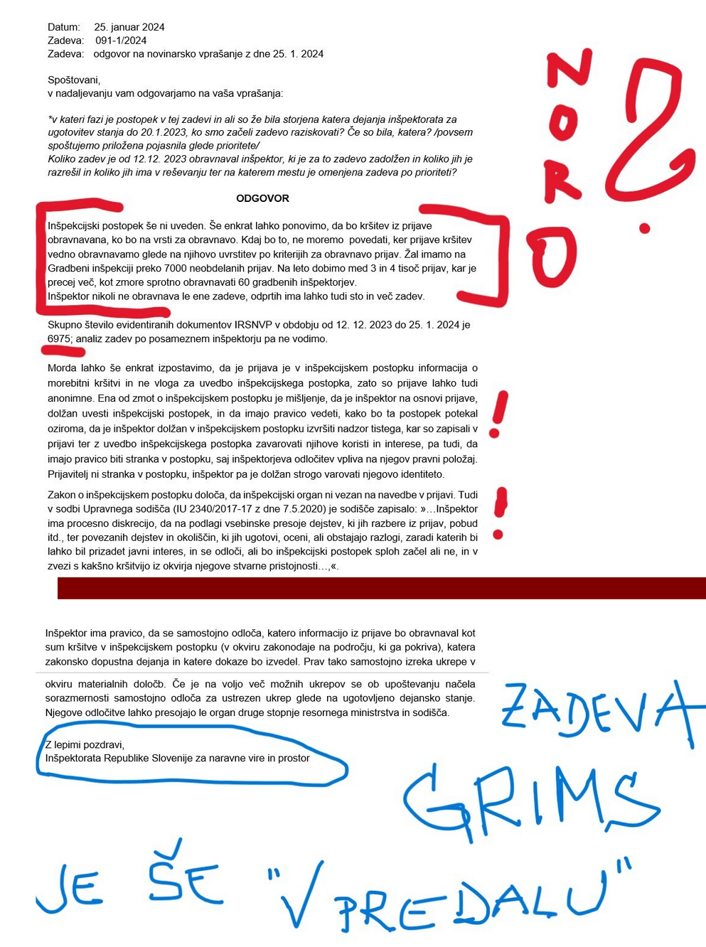 Spoštovani, zadeva še ni prišla na vrsto za obravnavo.Zakon o inšpekcijskem nadzoru določa, da prijava predstavlja zgolj obvestilo oziroma pobudo organu za morebitno uvedbo inšpekcijskega postopka, ne pa zahteve za njegovo uvedbo. Merila za obravnavo prijav so določena v 88. členu Gradbenega zakona (GZ-1) in dodatno pojasnjena v javno dostopnem dokumentu Kriteriji za določanje prioritetnih inšpekcijskih nadzorov.Vsaka prijava se pregleda in razvrsti glede na tveganje za ljudi, okolje in javni interes. Prednost imajo primeri, ki pomenijo neposredno ogroženost zdravja, življenja, varnosti ali večjega premoženja. Nova prijava z večjim tveganjem se tako obravnava pred starejšo in manj nujno.