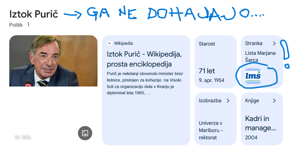 Iztok Purič je upokojenec za katerega verjetno malokdo lahko našteje zaporedje političnih pripadnosti=strank! Zato je razumljivo, da ga ne dohaja niti prosta enciklopedija, ga pa prehiteva dnevna politika. Kranjčan je zdaj kandidat na volitvah za državni zbor na listi stranke Prerod Vladimirja Prebiliča. Ja, kako, hudiča - ali ni bil nazadnje pri Šarcu, prej pri Bratuškovi ? Bil. Ampak sta oba njegova prejšnja šefa utopila stranki v Svobodi, sama pa se korajžno spopadla z novimi funkcijami in - stolčki. Nekdanji komunist Iztok pa je seveda med tem menjal stranke kot "spodnje ...."! Pa ne samo to: funkcij in položajev tudi manjkalo. Še dobro se spomnimo, kako je z Alenko Bratušek pogorel na županskih volitvah v Kranju.....Takole sta obsedela po klofuti kranjskih volivk in volivcev....