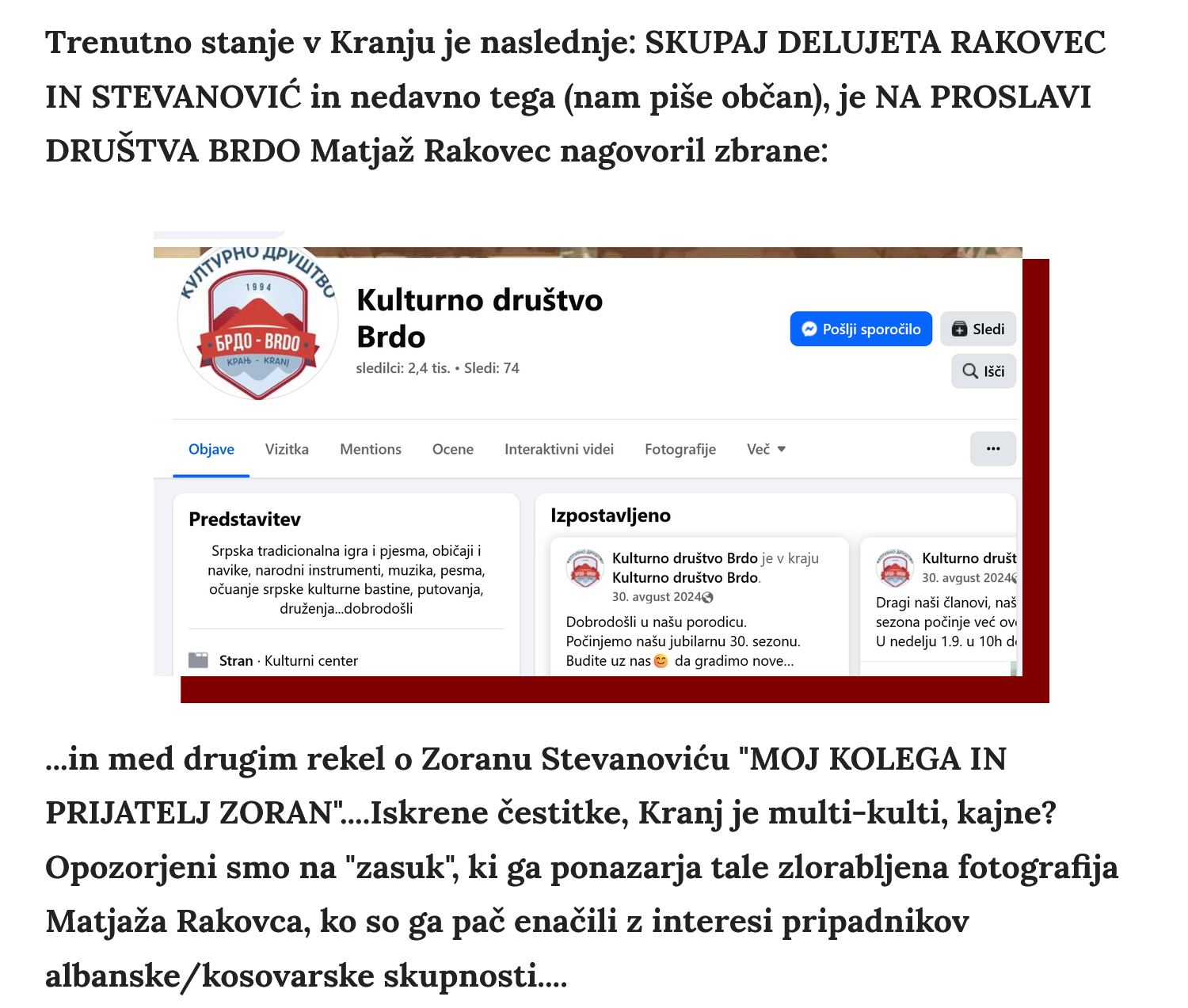 Vsakdo se lahko politično udejstvuje, kandidira, ustanovi stranko ipd. Toda javnost ima pravico zvedeti vse o njegovem političnem in veliko tudi o zasebnem življenju, ker gre za javne osebnosti. To velja tudi za "kranjski parček" Zorana in Matjaža in podatke o političnih ipd. odnosih, razmerjih in povezavah. ZA KRANJČANKE IN KRANJČANE KLJUČNO VPRAŠANJE: KO STE, ČE STE VOLILI MATJAŽA RAKOVCA - STE VOLILI TUDI ZA ZORANA STEVANOVIĆA, KER ZDAJ DELUJETA SKUPAJ V MNOGIH PRIMERIH? ODGOVOR BOSTE LAHKO DALI LETOS NOVEMBRA NA LOKALNIH VOLITVAH.