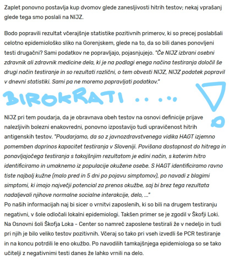 Saj ni res ... pa je: KRANJ SLOVENSKI REKORDER!!! MED 1090 TESTIRANIH UČITELJIC, UČITELJEV IN ZAPOSLENIH NA ŠOLAH V KRANJU KAR 164SKUPA POZITIVNIH! MED 18 021 TESTIRANIH PO VSEJ SLOVENIJI PA SKUPAJ 239 POZITIVNIH...Po Sloveniji torej 1,3 odstotek pozitivnih - v Kranju pa 17 odstotkov! Čudno? Hitri testi so do zdaj že vzbujali pozornost, tale kranjski primer pa kar kliče po ustreznem odzivu: vse pozitivne še na PCR test, ker se spomnimo šole kjer so bili kasneje vsi "hitropozitivni" na "pravem testu" - negativni...Pa da vidimo! Zaprta je šola v Besnici, tudi drugod so nekateri razredi v karanteni....ČAKAMO ODGOVORNE, DA ZADEVO POJASNIJO, KER V KRANJU VIRUS KAR CVETI!!! IN ŠE TOLE: POZNAMO VSAJ EN PRIMER, KO JE BILA NA HITREM TESTU VČERAJ POZITIVNA OSEBA, KI JE COVID 19 PREBOLELA PRED DVEMA MESECEMA....