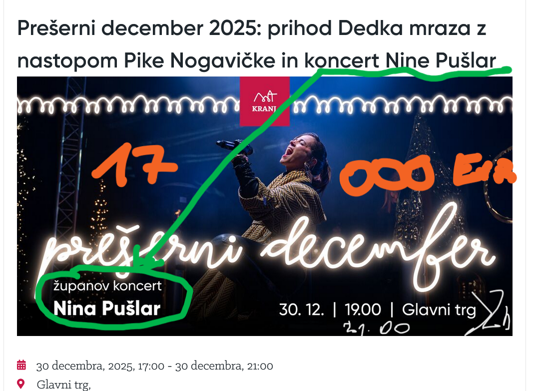 Koliko je do zdaj prejela za nastope v Kranju pevka Nina Pušlar in koliko bo stal županov koncert kjer bo izvajalka in koliko je znašal račun za 3. dec 2025? /prosimo za odgovore po letih oz plačanih zneskih/