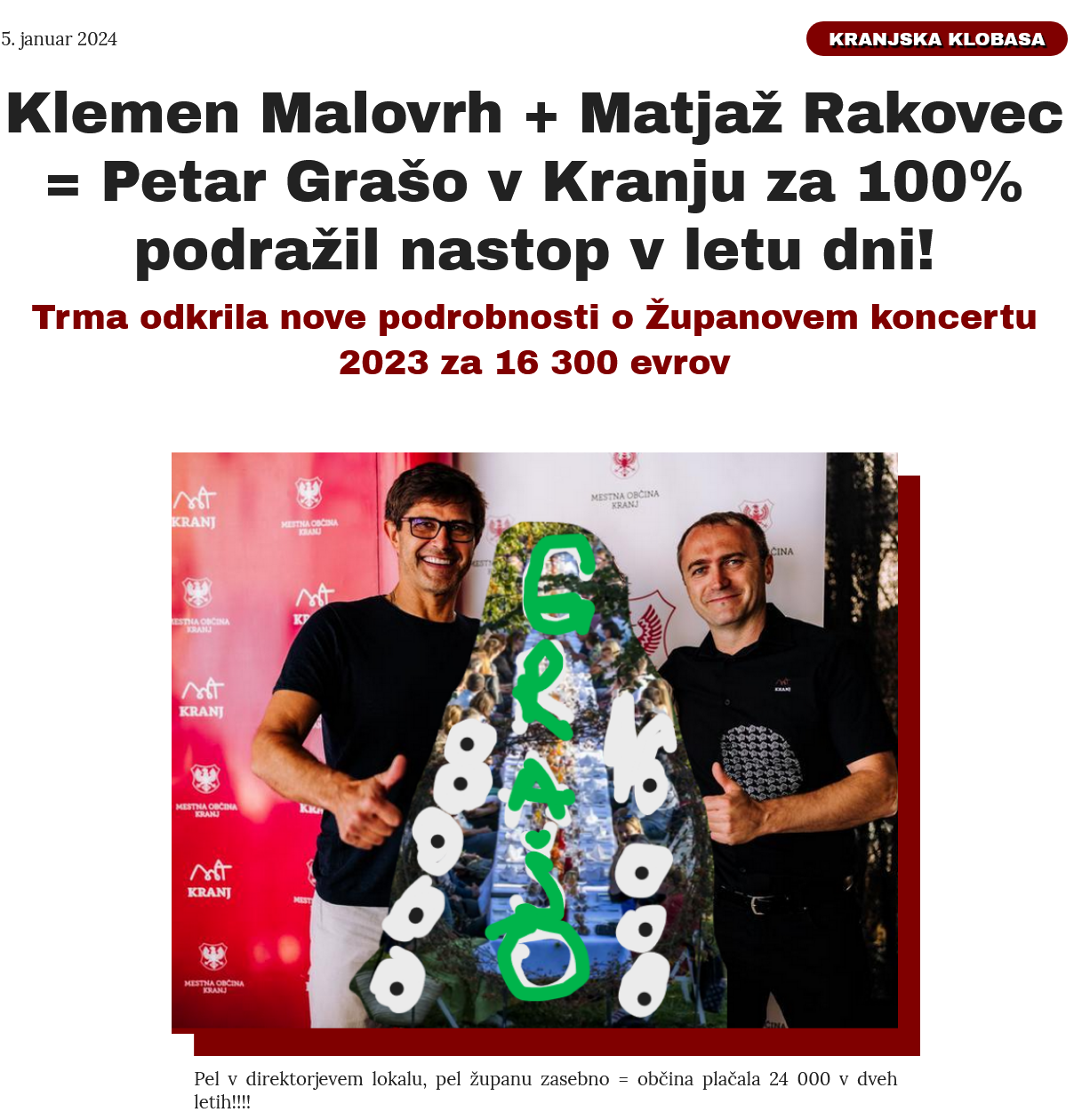 SKUPAJ TO ZNESE RES ŽE KAR NEVERJETNIH 67 000 EVROV V ŠESTIH LETIH ALI 11 000 EVROV LETNO! Rekorder je Peter Grašo, ki ga rad posluša županski par /Matjaž in Urša/ in je leta 2023 zaračunal za županov koncert 16 jurjev... s pripombo, ki jo je treba upoštevati: še preden je gostolel hrvaški slavček na Glavnem trgu, je počastil s pesmijo rojstnodnevno zabavo Rakovčevih, ki pa je potekala v - lokalu kjer je večinski lastnik upravljavca lokala Klemen Malovrh, mimogrede še direktor javnega zavoda, ki potem plača istega izvajalca za županov koncert.....