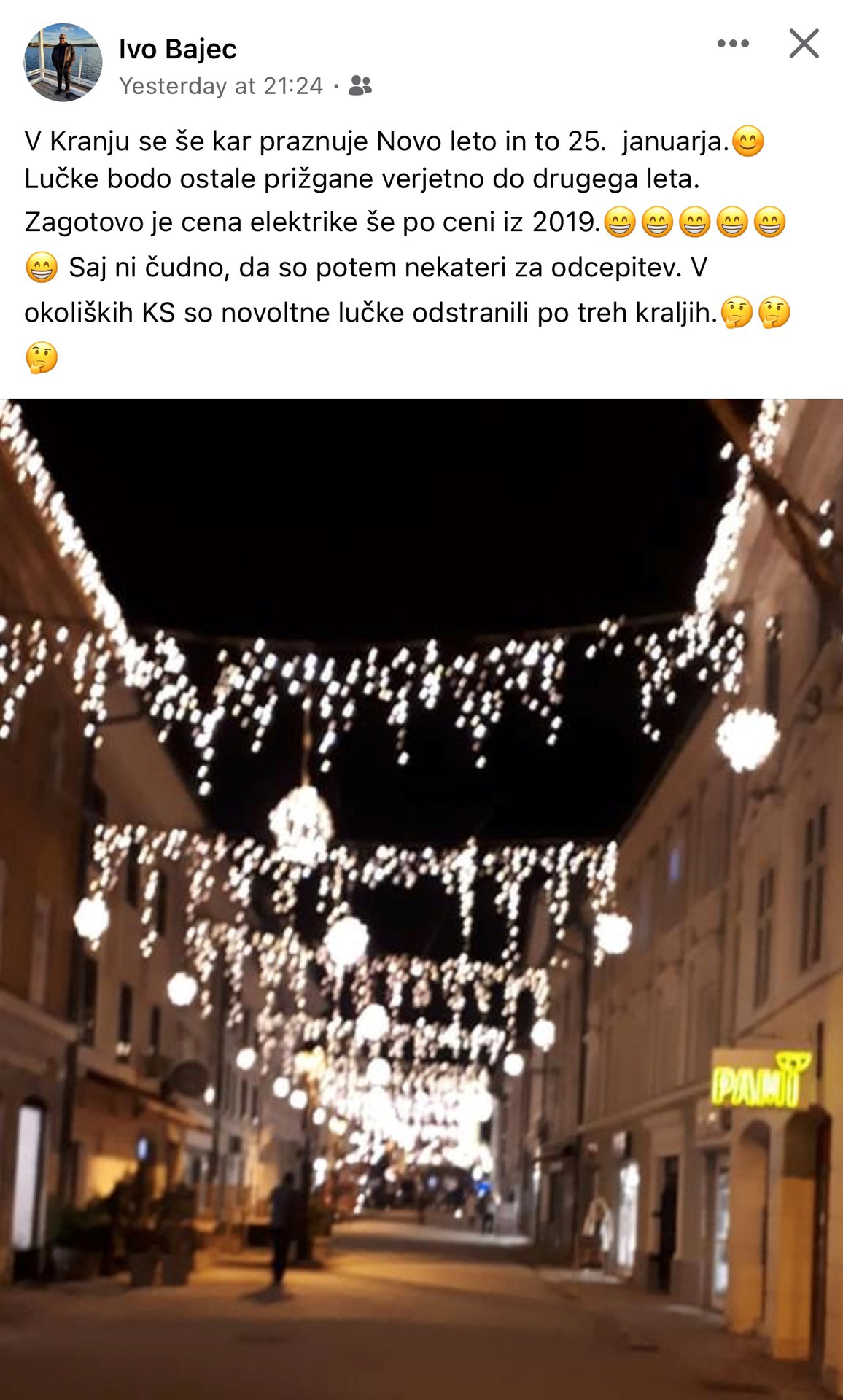 Klemen Malovrh kot direktor Zavoda za turizem in kulturo lahko prižge lučke v mestu preden to stori župan Rakovec. "Nadžupan" Malovrh pa očitno ne ugasne lučk ampak čaka na "direktivo": ZATO NA POTRATO ENERGIJE V ČASU, KO SE ELEKTRIKA DRAŽI NAVADNIM LJUDEM, OPOZORI NA SPLETU IVO BAJEC. KI PA NI KAR TAKO: JE PREDSEDNIK NADZORNEGA ODBORA MO KRANJ IN "SVEŽI" UPOKOJENEC! Da nam konec januarja lučke gorijo, je seveda nesmisel svoje vrste in zato bi bilo treba seveda prositi "nadžupana Malovrha", da ugasne kar je prvi prižgal. CENA ENERGIJE ZA OSVETLITEV GRE V DESET TISOČE EVROV..AMPAK NIČ ZATO: