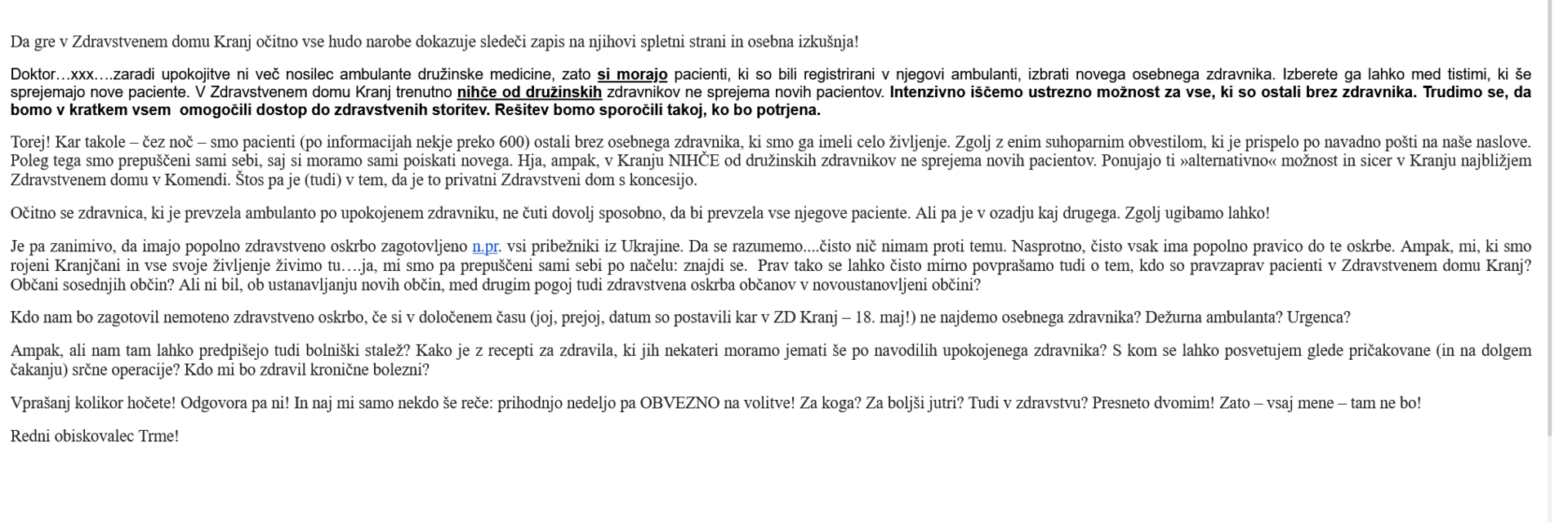 16. april 2022Kranj+ O dostopu do zdravnika v Kranju nam piše bralec Trme. Objavljamo brez posegov v tekst in s pripisom, da gre za osebno izkušnjo. Vprašanja iz stiske, ko človek "izgubi" zdravnika ali pa slednji pacienta.... V VEDNOST BOMO POSLALI ŽUPANU IN DIREKTORICI ZD KRANJ. KAJ TAKEGA SE LAHKO JUTRI ZGODI VSAKOMUR OD NAS.