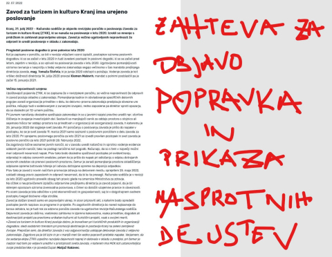Objava popravka Zavoda za turizem in kulturo Kranj v zvezi z objavo Pošten razpis direktorja Malovrha: kako je za stalno zaposlil delavko, ki je takoj odšla na porodniško in kaj skuša skriti javnosti!?