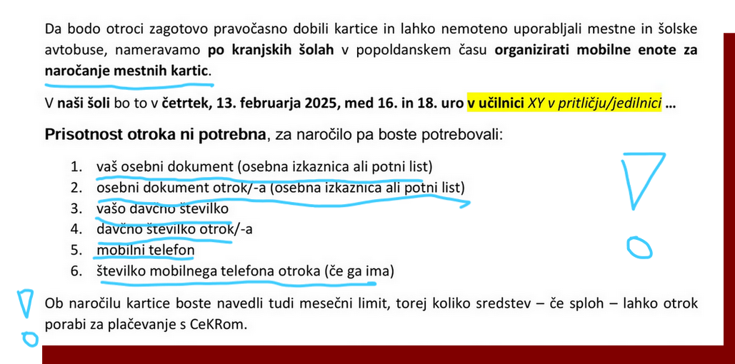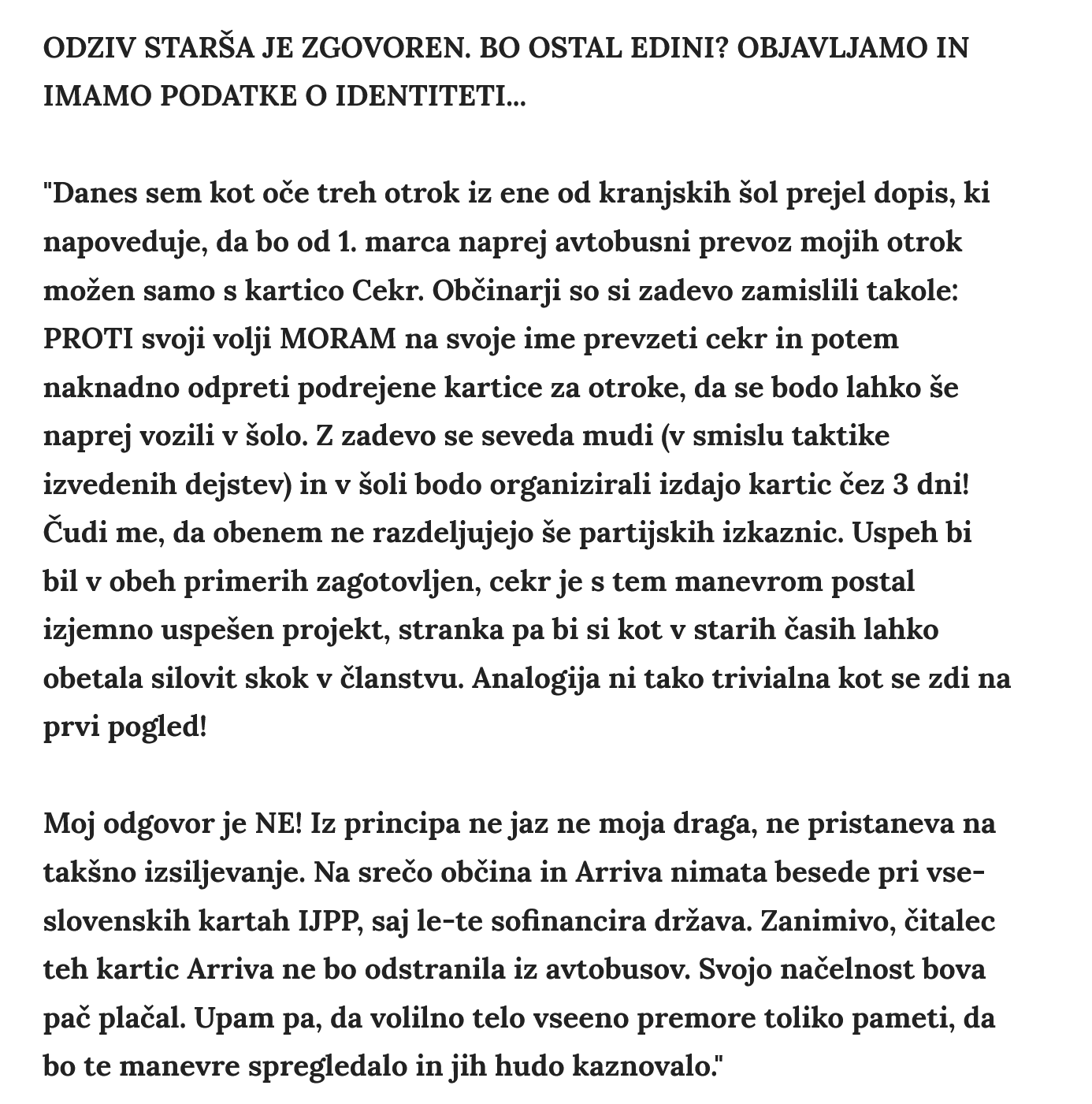 opoZagate s prevozi oziroma kartico CEKR so pomenile ukrep občine,ki je od staršev in otrok terjala zajem osebnih podatkov. Kakšnih? Takih!