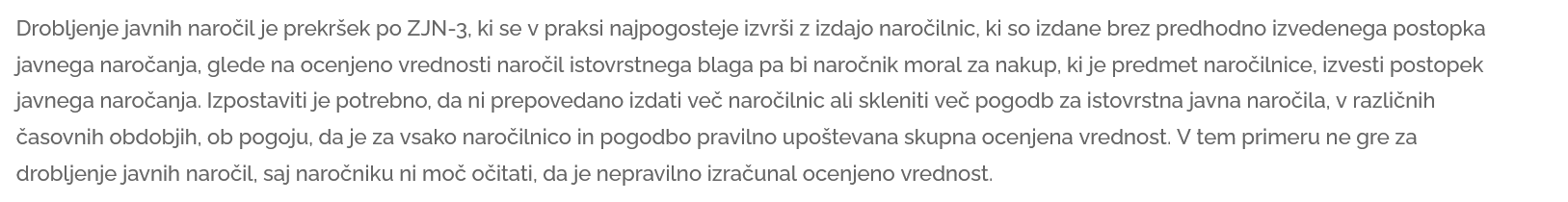 Opomba: nekdo je pazil na zgornje okvire pravil pri naročanju in izdaji naročilnic..TODA KAJ PA VSEBINA ? TAKO IMENOVANO DROBLJENJE JAVNIH NAROČIL NI ZAKONITO, KER JE VELIKOKRAT LE NAČIN, KAKO SE IZOOGNITI PRAVILOM IN OMOGOČITI KOMU ZASLUŽKE MIMO NJIH... RAZLAGA JE NEDVOMUNA: