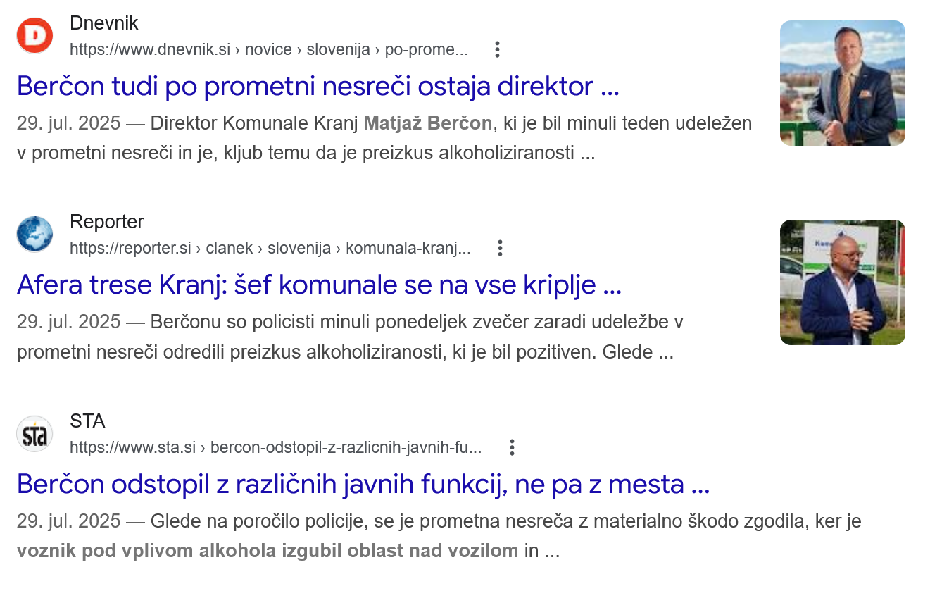 t"Prejel sem sodbo v kateri višje sodišče potrjuje sodbo okrajnega sodišča na Jesenicah in sprejemam odgovornost. Zato bom ponudil odstop s svoje funkcije skupščini Komunale Kranj. Sprejemam odgovornost za storjeno napako, kazen je denarna in so kazenske točke,rma" je ekskluzivna izjava Matjaža Berčona, ki je lani poleti zakriviil prometno nesrečo pod vplivom alkohola s službenim vozilom in potem ponudil nekaj inačic dogodkov. Policija je preiskala nesrečo in okoliščine in na jeseniškem sodišču je bila glede na to izrečena sodba, ki jo je potrdilo po pritožbi višje sodišče v Ljubljani. S tem je verjetno direktorska kariera Matjaža Berčona na Komunali končana - a odloča seveda skupščina lastnikov, ki so naslednji:
