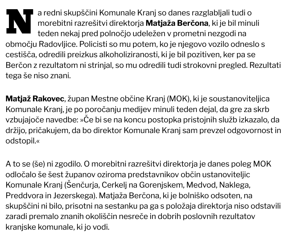 Ko smo o izidu postopka vprašali direktorja Berčona, nam je pojasnil, da pred pravnomočnostjo postopka ne komentira.....