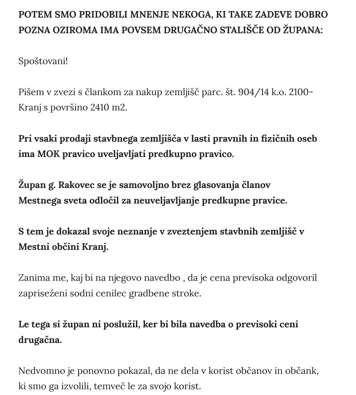 Matjaž Rakovec je osebno in kot odgovorna oseba sprejel odločitev, ki ni podprta s sklepom mestnega sveta, ker o tem sploh niso odločali - predlagatelj gradiv za mestni svet je seveda večinoma župan. Ko je bilo zemljišče, ki je naravnost idealno za javno parkirišče ob zdravstvenih ipd. ustanovah ponujeno občini, SE JE ŽUPAN RAKOVEC ODLOČIL, DA JE TO PREDRAGO IN TAKO JE - PO DO ZDAJ ZNANIH PODATKIH - KUPEC PODJETJE DOLNOV KAR SEVEDA LAHKO ŽELENO JAVNO PARKIRIŠČE SPREMENI V ZASEBNO OZIROMA V VIR DODATNIH ZASLUŽKOV. KAR SE PODJETNIŠTVA TIČE: ODLIČNO - KAR SE TIČE JAVNEGA INTERESA PA JE TO LAHKO ZA VEDNO IZGUBLJENA PRILOŽNOST ZA DELNO REŠITEV PROBLEMA OB GRADNJAH NA ZLATEM POLJU.