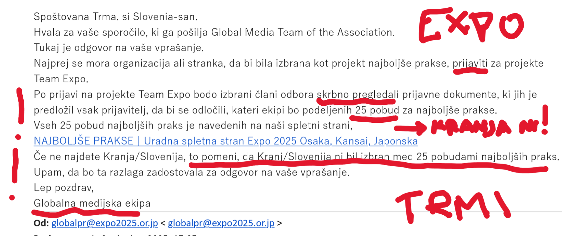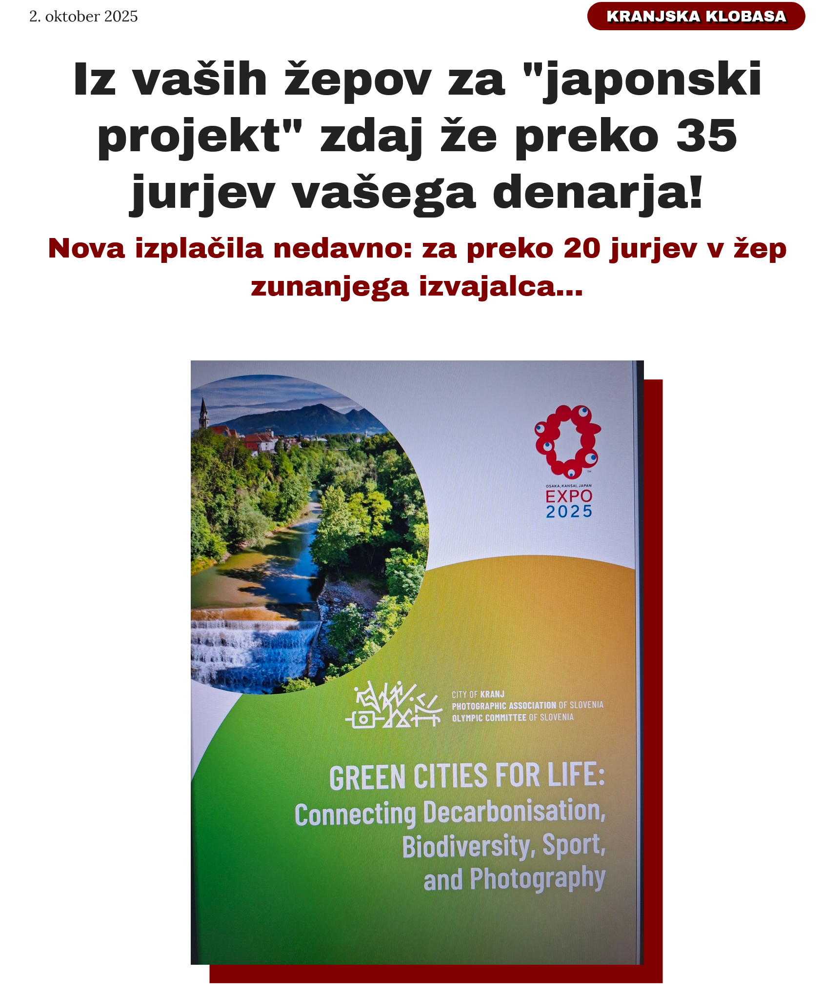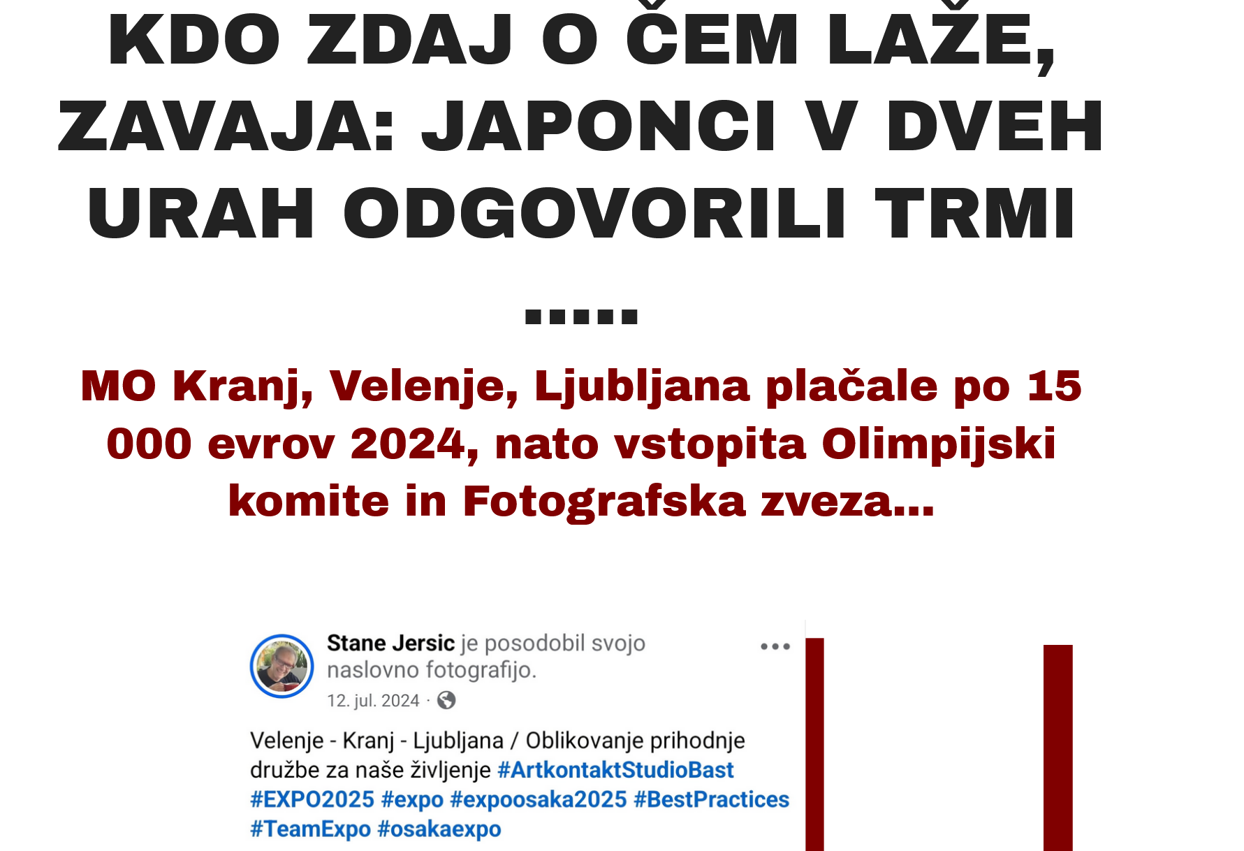 MO Kranj /tudi MO Velenj in MO Ljubljana/ so plačale vsaka po 15 000 evrov /skupaj 45 000/ Stanku Jeršiču za projekt, ki ni bil realiziran in nikdar predstavljen na EXPO v Osaki na Japonskem. To potrjuje uraden dopis iz Osake: Kranj oz >Slovenija se ni uvrstila med 25 projektov, ki so bili izbrani.
