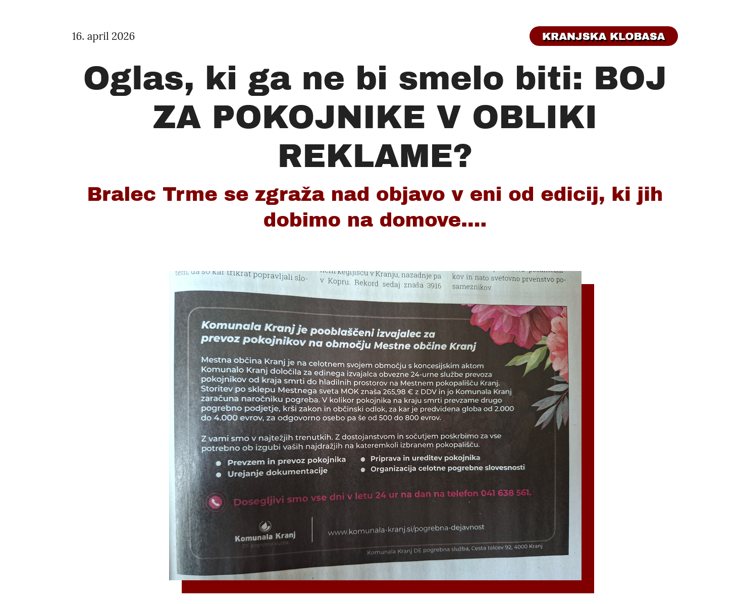 Potem, ko je javno podjetje Komunala Kranj objavilo v mediju Kranjčanka oglas o pogrebnih storitvah, so se oglasili tudi z druge plati - pogrebniki = podjetniki! Njihovi argumenti so nanizani spodaj in pomenijo seveda tudi napotek za uporabnike...mi pa bomo zastavili vprašanja še komu!