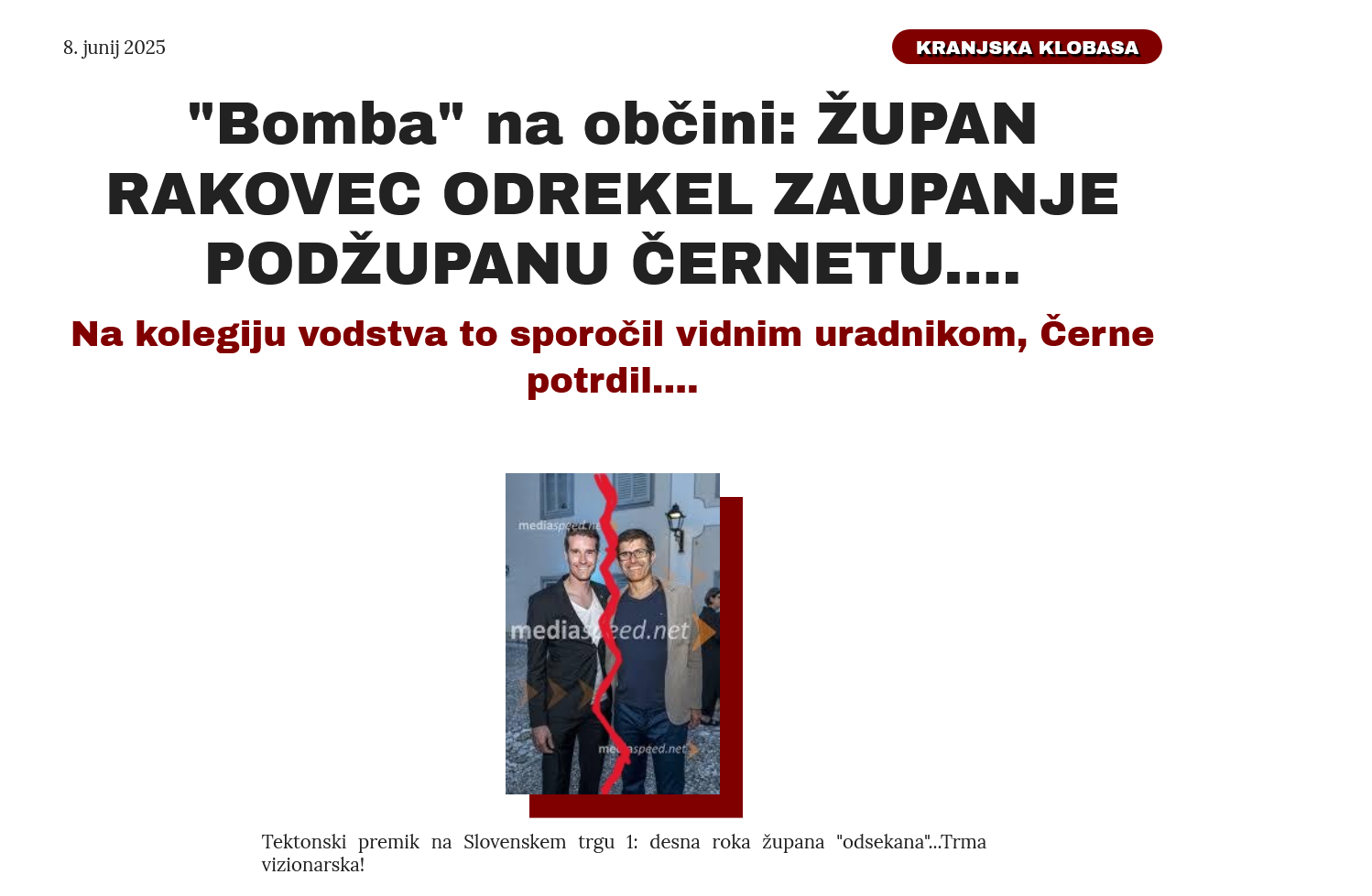 Nesporno kadrovska poteza leta na levi strani političnega pola v Kranju: župan Rakovec je "odstopil" podžupana Černeta /oba SD/ potem, ko ni župan ni uspel s predlogom za šefico Prešernogea gledališča, proti je bil tudi podžupan, ki je dejansko pred sedmimi leti s pomočjo stranke ustoličil Rakovca, politično do takrat anonimnega....Revolucija žre lastne otroke, so nekoč pisali teoretiki - v praksi je to zgledalo tako, da sta se razšla res najbolj tesna sodelavca. Černe je ostal tako brez službe, preživlja se z zasebnim podjetjem, mnogi v njem vidijo nasprotnika Rakovcu na volitvah 2026.
