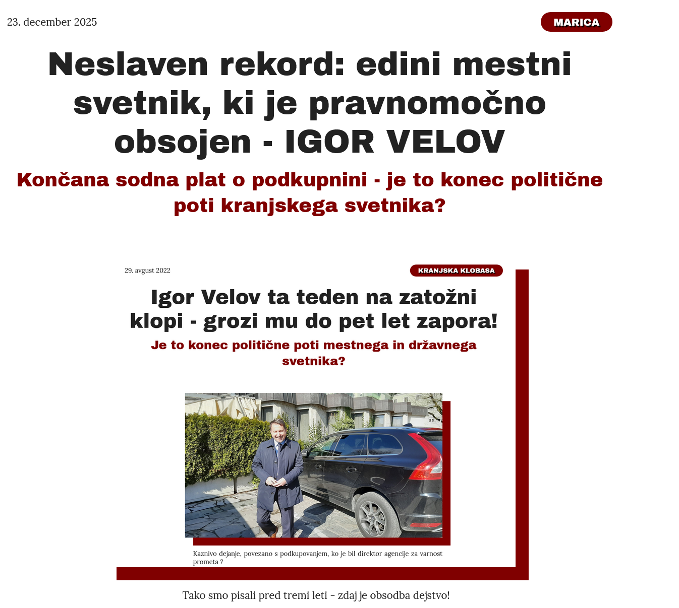 Koncem leta še prvi pravnomočno obsojeni politik - mestni svetnik Liste za razvoj Kranja Igor Velov (zaradi podkupnine, ki jo je obljubil oziroma predlagala na račun kranjskega špotnega društva...). Po pravnomočni sodbi višjega sodišča je - v slovenskem političnem slogu - zatrdil, da odstopil pač ne bo - a s tem bremenom je resna kariera v politiki bržčas vprašljiva. Vemo pa nikdar ne, kajne?