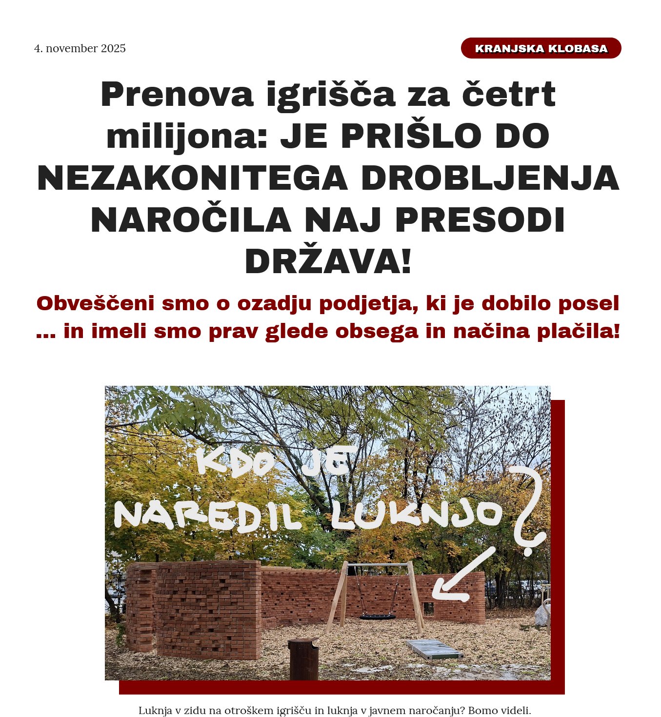 Trma. si je objavila vse o premajhnih učilnicah, dodali smo dosedanji sporen potek prenove otroškega igrišča kjer smo najprej od Rakovca in njegovih dobili zlagan, napačen, zavajajoč odgovor - KRONA VSEGA PA JE NAŠE POTRJENO ODKRITJE, DA DRŽAVA 1,2 MIO EVROV DENARJA NE BO POSLALA V KRANJ, KI SE JE S TEM V MEDIJIH HVALIL. ZDAJ SO GLEDE KATASTROFALNEGA IZPLENA MANJ ZGOVORNI. PREBERITE, KAJ SO NAM ODGOVORILI GLEDE ODGOVORNOSTI IN POSLEDIC ZA MILČIJONSKI IZPAD V PRORAČUNU: