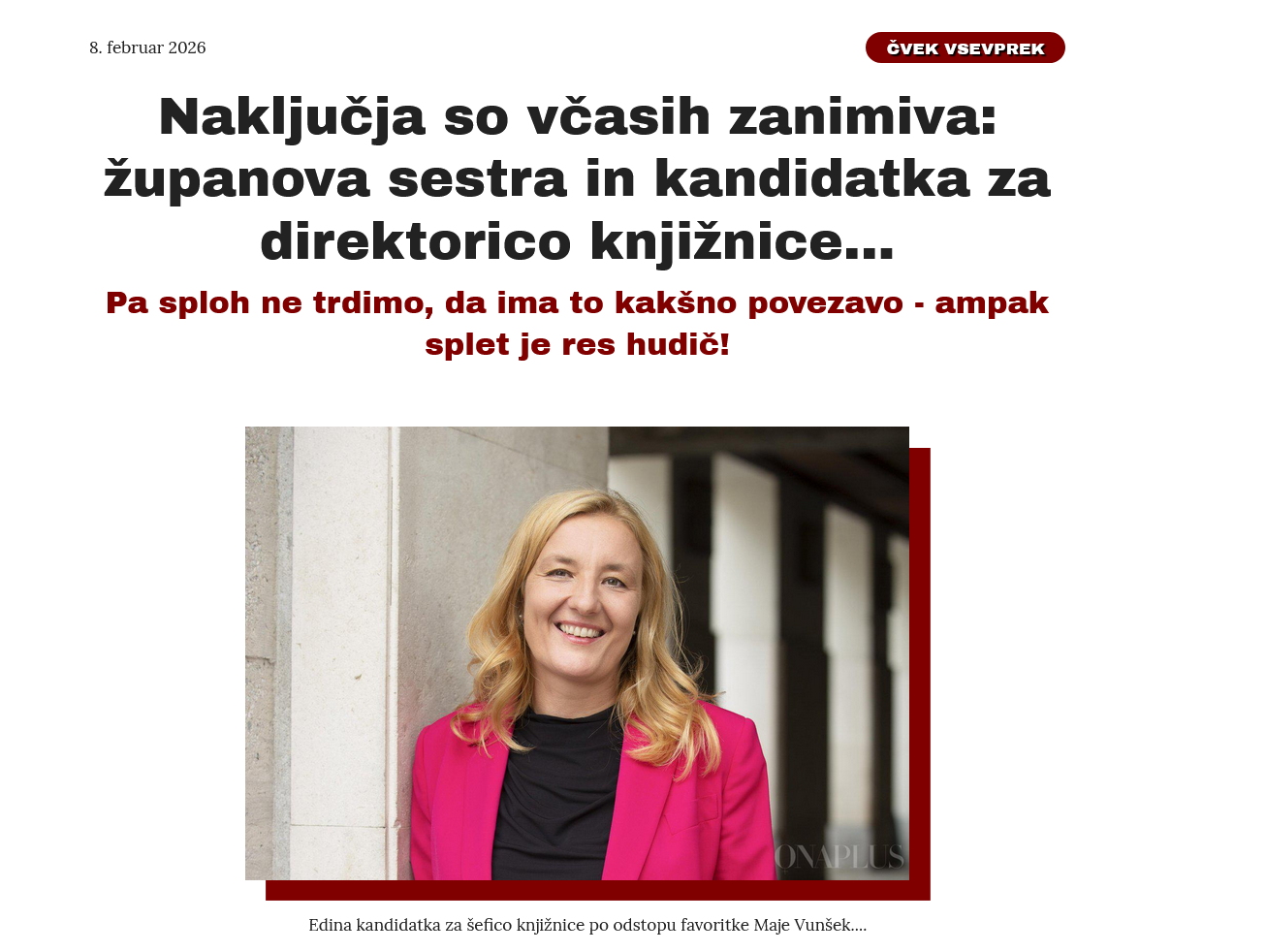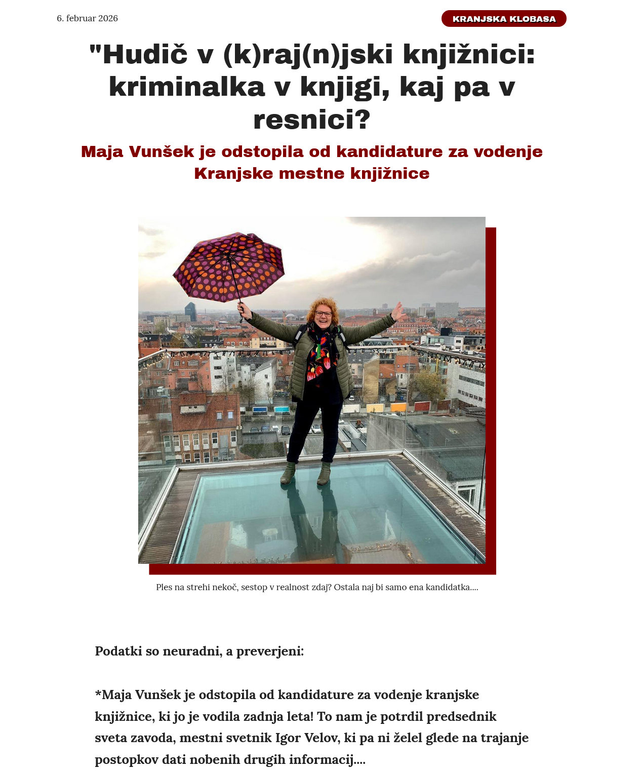 Ker je že prej odplesala z vrha knjižnice Maja Vunšek, dosedanja prva dama Mestne knjižnice Kranj, je pred organi javnega zavoda nova naloga: bržkone ponovoljen razpis! Danes bo seja sveta zavoda in potem se bo ta klobčič zopet začel odmotavati...Če pa se spomnimo zagat v Prešernovem gledališču, smo priče novemu dokazu o tem, kakšne kadrovske zagate se nam dogajajo....