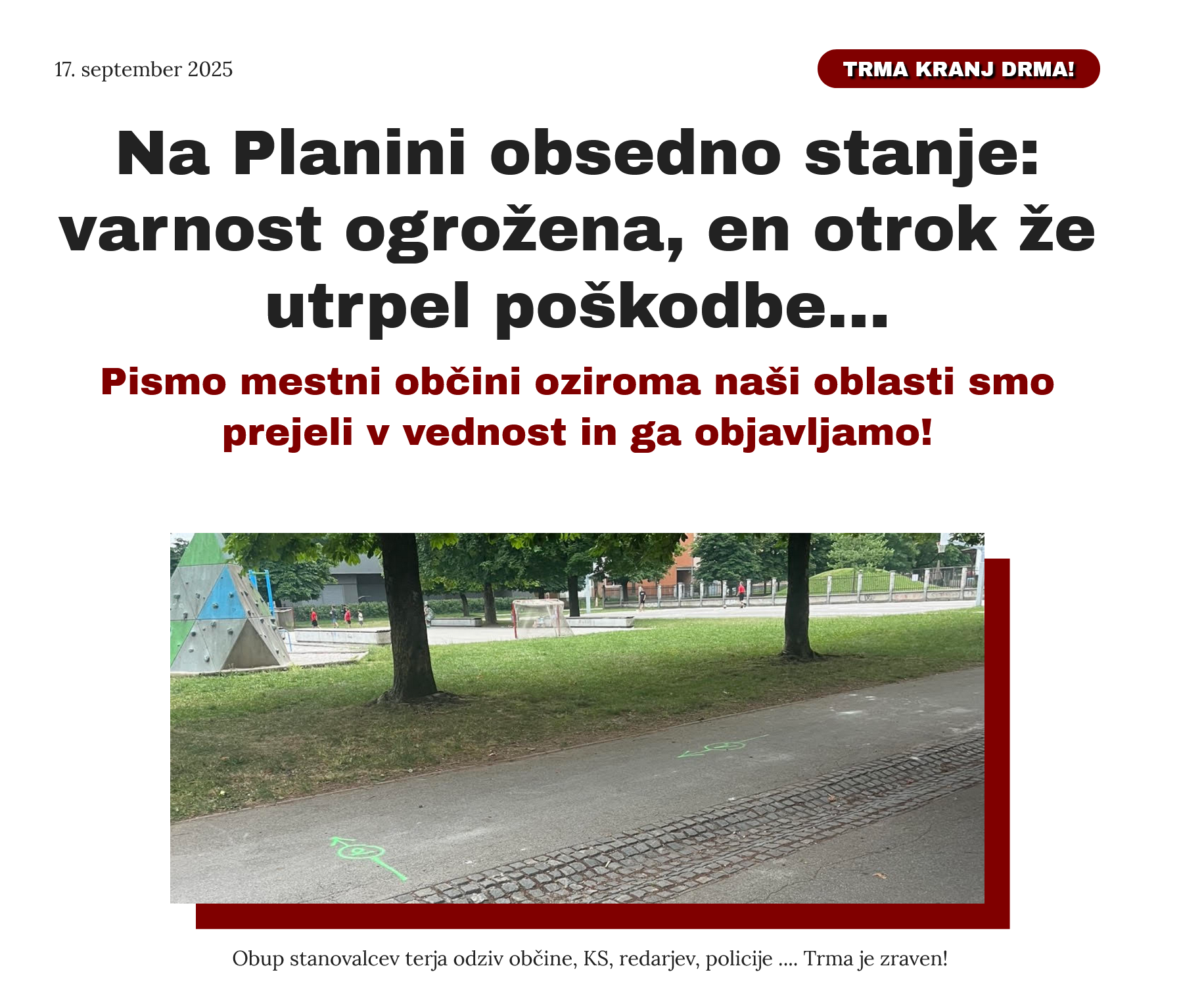 Redko dobimo kaj tako pretresljivega kot je pismo s Planine 1 kjer očitno stvari uhajajo izpod nadzora. Življenje ljudi je postalo prava mora, opozarjajo pa na obnašanje skupin otrok in mladoletnikov in tudi starejših, ki terorizirajo stanovalce z različnimi objestnimi in nasilnimi dejanji....