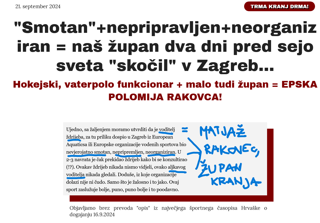 POTREBNO JE DODATI ŠE ODSOTNOSTI ZARADI POTOVANJ MATJAŽA RAKOVCA KOT FUNKCIONARJA V VATERPOLU IN HOKEJU - TUDI TEH ODSOTNOSTI JE VSAKO LETO KAR NEKAJ (GRE ZA ZASEBNE POTI, A ŽUPANA SEVEDA NI V SLUŽBI... TUJI MEDIJI SO NJEGOV NASTOP V ZAGREBU VZELI KOT - SRAMOTEN...