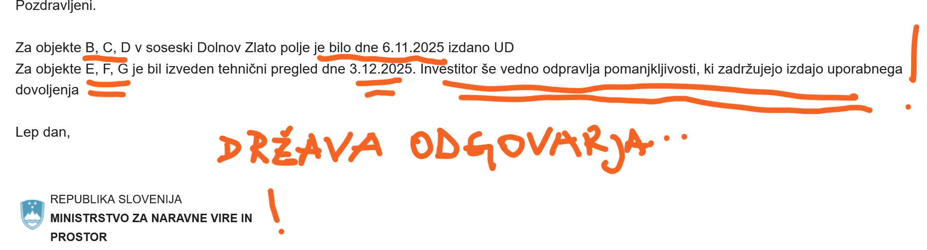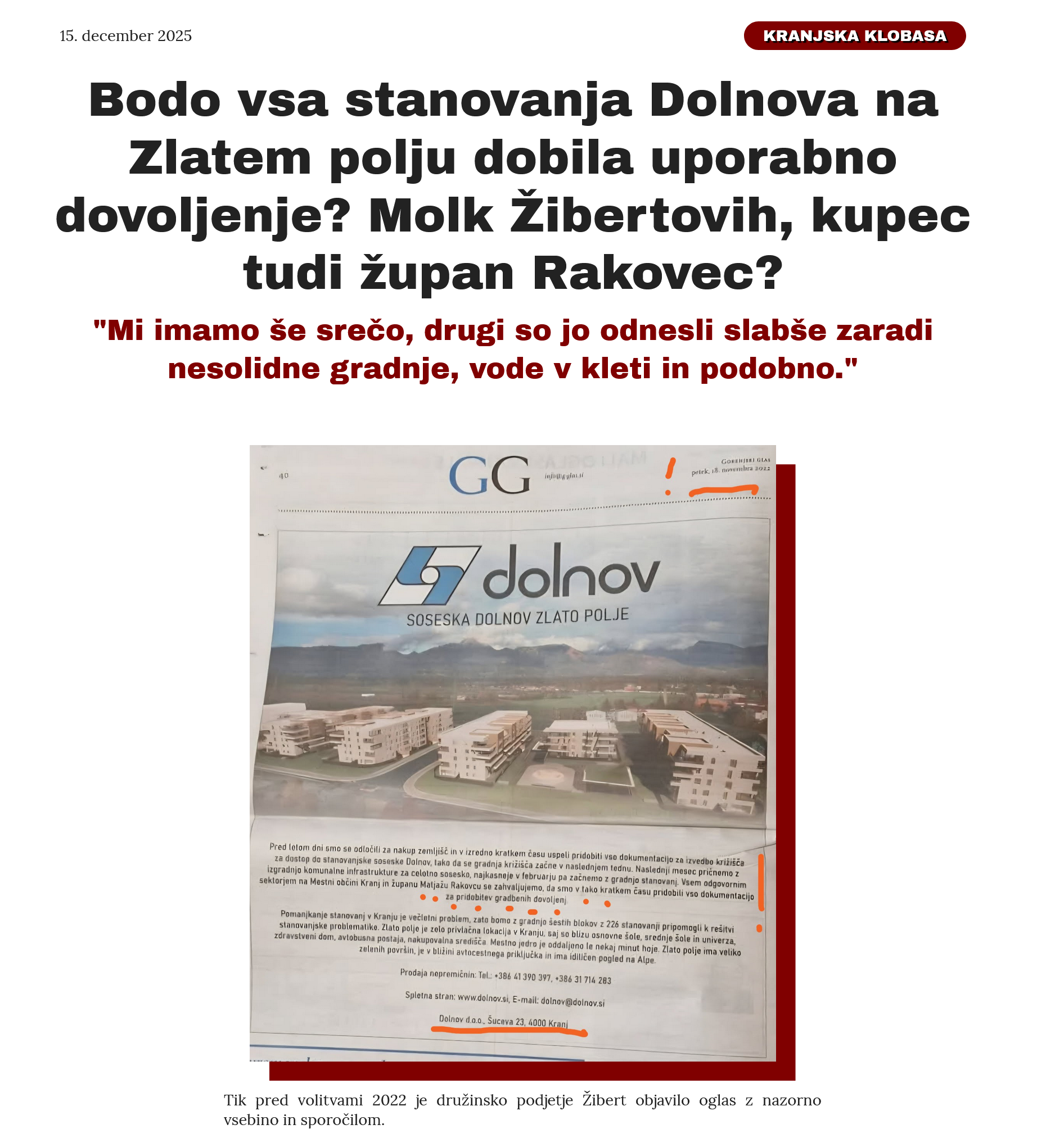 Pismo, ki smo ga prejeli na naš naslov, je stališče, mnenje, ocena kupca stanovanja v soseski Zlato Polje /investitor Dolnov, družina Žibert/: