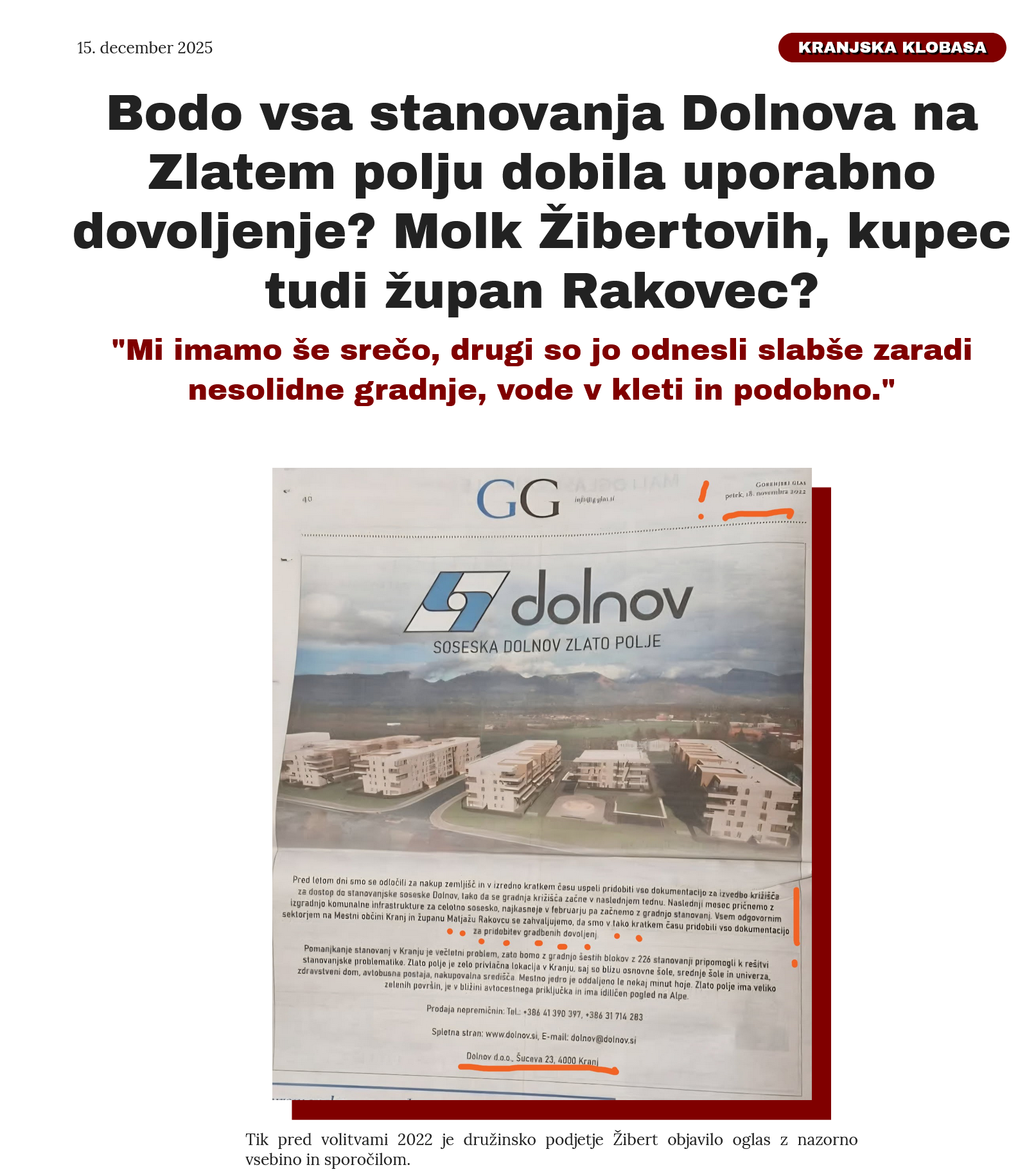 GRE ZA STOTINE KUPCEV IN STANOVANJ IN ZATO JE SEVEDA PRAV, DA IMAJO PRAVE PODATKE O SOSESKI. SLEDNJA JE PRVI KORAK /PRIDOBITEV GRADBENEGA DOVOLJENJA/ TAKOLE ZAČINILA S PLAČANIM OGLASOM O VLOGI MO KRANJ=ŽUPANA MATJAŽA RAKOVCA /LETO 2018!!!/