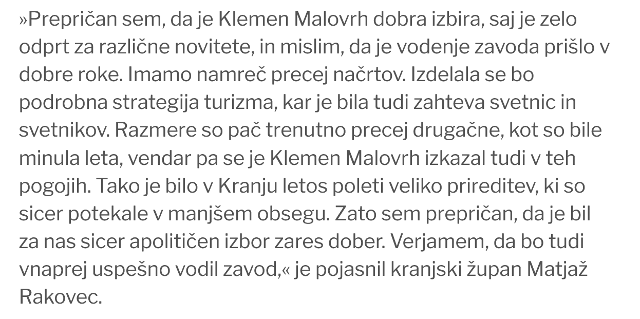 Tole je razpis, ki smo ga našli na strani Zavoda za turizem in kulturo Kranj. Kje so ga še objavili, ne vemo...Da bo vse po regelcih bo skrbel "glas iz ozadja"! TAKOLE PA JE BIL NEPOSREDEN ŽUPAN MATJAŽ RAKOVEC OB IMENOVANJU KLEMENA MALOVRHA ZA DIREKTORJA ZAVODA, KI PREJME LETNO OKOLI 1,1 MILIJONA EVROV JAVNEGA DENARJA IZ NAŠIH ŽEPOV...