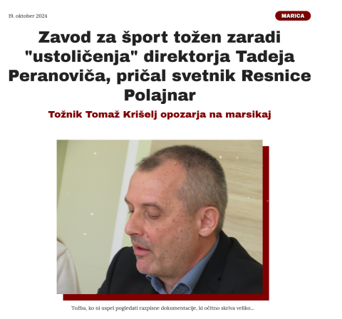 Zavod za šport tožen zaradi "ustoličenja" direktorja Tadeja Peranoviča, pričal svetnik Resnice Polajnar
