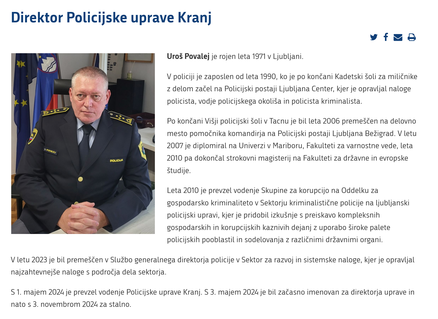Kadrovske odločitve se v policiji izvajajo skladno s predpisi in po postopkih, ki veljajo za izbor na posamezno delovno mesto. Policisti se na zahtevnejša delovna mesta premeščajo ob izpolnjevanju predpisanih pogojev. Javni uslužbenec izpolnjuje vse pogoje za zasedbo delovnega mesta pomočnika komandirja na Policijski postaji Kranj. Na tem delovnem mestu je začasno od septembra 2024 dalje.