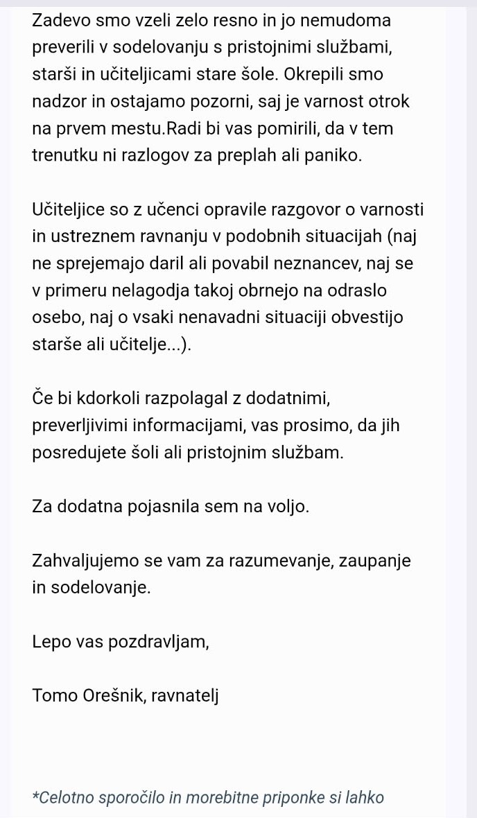 Pri vsem tem je koristno poudariti, da moramo biti vsi pozorni na kakršenkoli sumljiv dogodek, posebej blizu šol, vrtcev ipd. Treba je zaščititi najbolj ranljive in vedno delovati v interesu otrok!!!! Ne opredeljujemo se glede ravnanj in odzivov, dogodek pa si že zaradi prevetive zasluži pozornost......