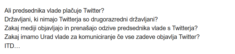 Takrat je bil še Tito Tito in Janez ni bil Twito kot mu zdaj pravijo. A zgodovina si zapomni, kako blizu svojega vzornika je bil že takrat: oba sta zmagala v vojni, oba sta/ bila /neomejena vladarja svoje stranke, oba sta /bila/nezamenljiva in brez konkurence, oba "nista priznala sodišča=krivosodja, oba...LE DA POKOJNI NI VEDEL, DA BO NEKOČ JANEZ POSTAL TWITO IN NAMESTO NA PARTIJSKIH PLENUMIH "ČIVKAL" SPOROČILA LJUDSTVU.... Toda res je vse na glavo postavljeno: "čivka" tudi tista političarka, ki se zaradi neodgovornih volivcev niti v parlament ni prebila - danes bi sestavljala vlade in napenjala loke, takole pa se je lotila početja Twita, ki je - roko na srce - na volitvah vedno nabral dovolj glasov, da je (p)ostal neomajni vladar svoje črede....za razliko od nesojene evropske komisarke, ki odstotke podpore šteje s prsti ene roke....