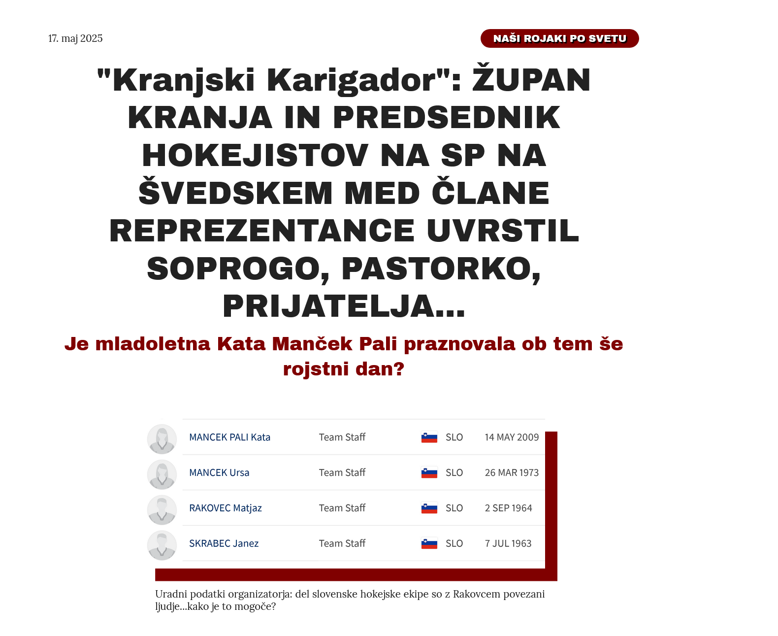 Kranjski župan Matjaž Rakovec je tudi predsednik Hokejske zveze Slovenije. Vlada oziroma država hokejskih prenoisov ni uvrstila med tiste, ki naj bi bili dostopni najširšemu krogu gledalcev - pa uspehov reprezentance seveda ne manjka. Hokje je sicer trenutno v krizi zlasti na Jesenicah, ki pa so zibelka tega športa pri nas. A v njem so tudi posebnosti, ki kažejo, da si lahko kdo privošči uzurpacijo reprezentance v zasebne namene in Trma.si je o hokeju o tem objavila nekaj kar je lahko razlog za oceno, da gre za - v športni družini - obroben šport, ki ima pri nas zanemarljivo množičnost in tudi pogoji so specifični. Mnogi hokejski klubi so pač finančno prešibki, da bi se razvijali - gre za ekstremno drag šport (led, dvorane, oprema ipd.). Takole pa o stanju naš zapis iz letošnjega leta ....
