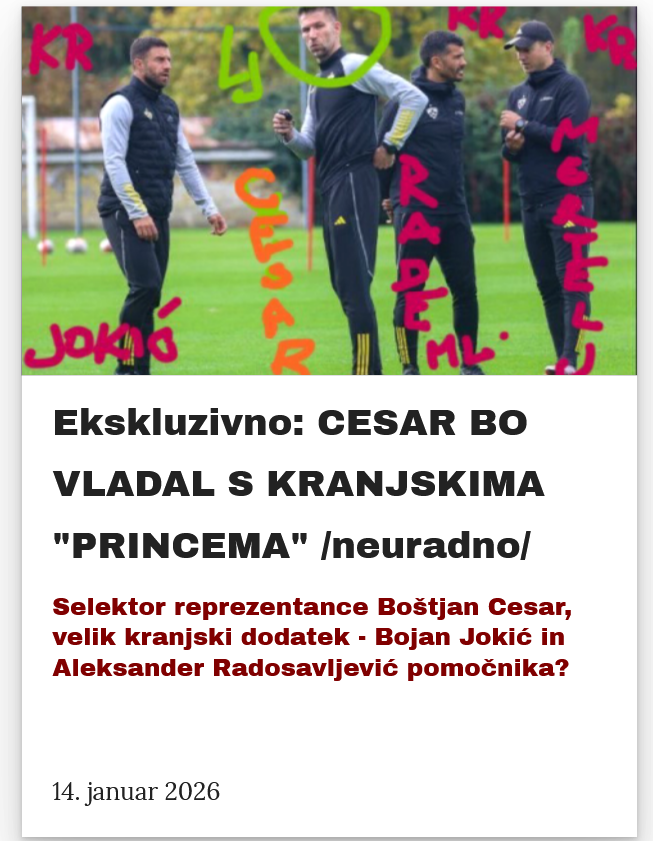 Novega selektorja slovenske nogometne reprezentance Boštjana Cesarja smo napovedali /in to objavili/ 14.janurja, skoraj pred tednom dni. Naš vir se je izkazal kot verodostojen, Trma je prehitela vse medije in dan po naši objavi so se zgnaili tisti, ki (ni)so brali, kaj sporočamo o eni najbolj zanimivih vlog v slovenskem športu. Nič zato, naše "prvenstvo" je za nas samo dvig samozavesti. Pri tem smo najavili dva "izdelka" kranjskega nogometa kot pomembna sodelavca novega selektorja. To sta Bojan Jokić in Aleksander Radosavljević, oba z bogato mednarodno igralsko potjo.