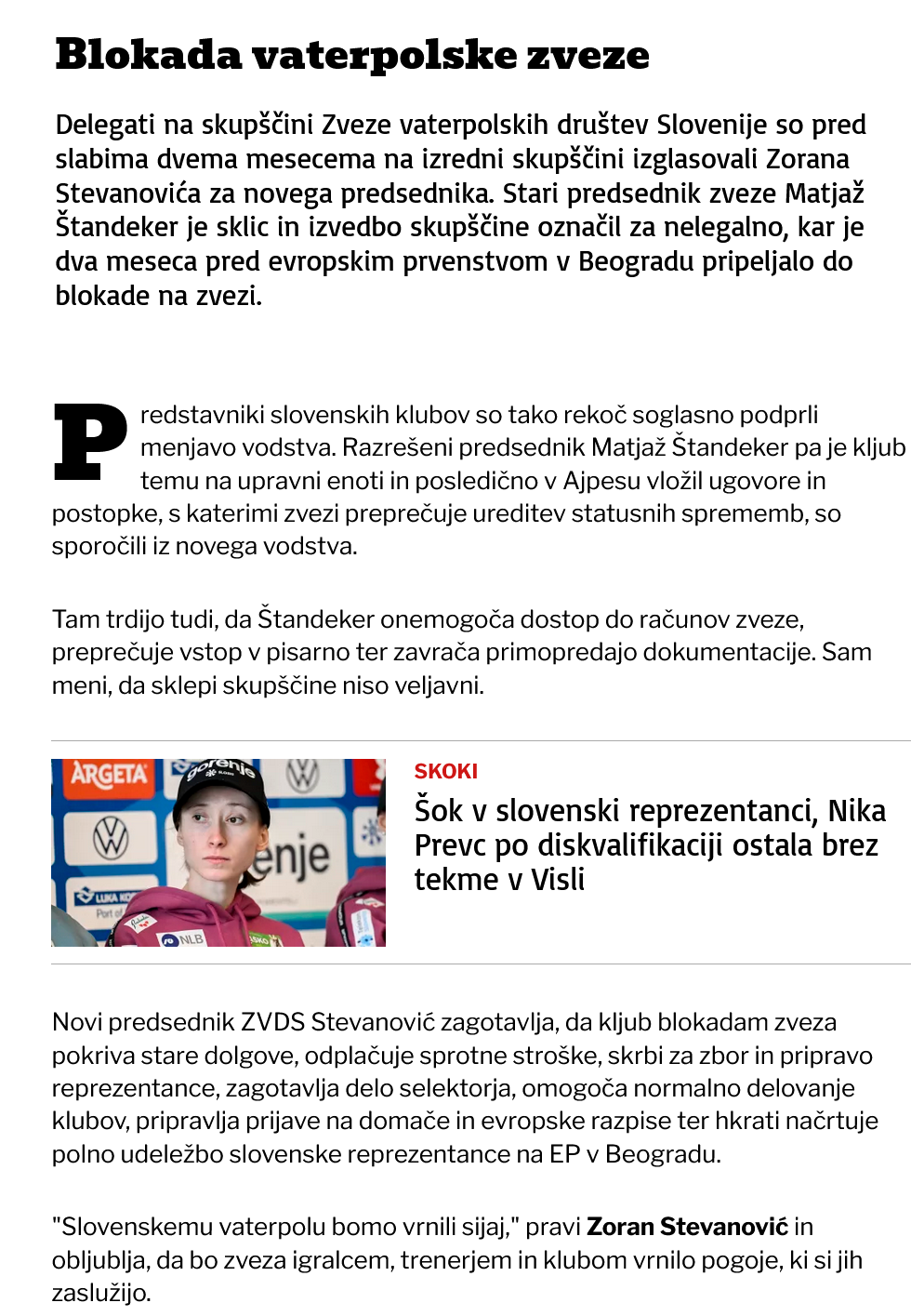 Potem, ko je postal "politični kimavček" župana Matjaža Rakovca v kranjskem mestnem svetu, je Zoran Stevanović objavil svoje predsedovanje v športu kjer je kajpak močno vpliven tudi isti Rakovec....Pa se je malo zalomilo vse skupaj, ker prejšnji predsednik ni sprejel razrešitve in je zdaj pač nastal pravni ipd. spor glede tega, kdo je pravi in kdo ne. Šport kjer je aktivno toliko klubov, da "jih mizar na prste ene roke prešteje", ima tako novo afero. Zaradi podobnih peripetij, malverzacij ipd. prejšnjih vodstev je propadla vaterpolo zveze, klubi so za povezovanje ustanovili združenje - a očitno ne bo šlo lahka z novim predsednikom, ki - roko na srce - morda na tej fotografiji prvič drži v roki žogo za sicer dolga leta vodilni kranjski šport. Zoki ima moč, da vse to premaga....?