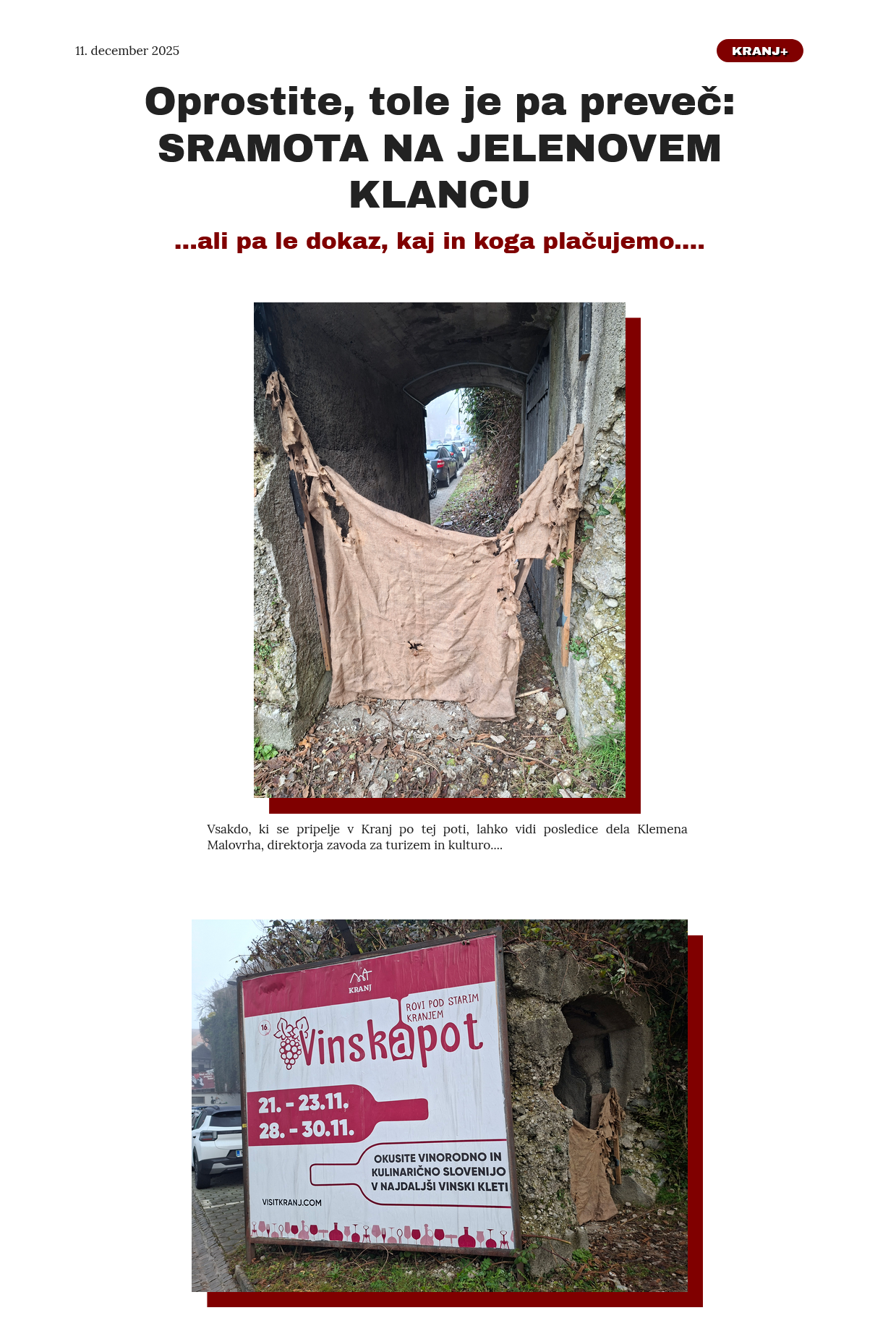 Zabiti, neuki in še kaj smo: spotaknili smo se ob tole podobo (za nas) sramote za Prešernovo mesto in se - grdo motili. Popravil in dopolnil nas je bralec Trme katerega obzorje duha daleč presega naše. V strgani žakljevini, zanemarjeni luknji tik ob vhodu v Kranjske rove je namreč prepoznal....UMETNIŠKO INSTALACIJO! Priznamo, da nam na misel ni prišlo kar je odkril prebivalec Prešernovega mesta, ki se imenuje tudi "srečno mesto"...če verjamete politiku, ki je to izumil. Morda pa je mislil s tem na srečo, ki jo imamo z njim(i) in seveda nesmrtnimi umetninami, ki nam jih privošči oblast, ki vlada /pravljičnih?/ sedem let...BRALEC TRME NAS IN VAS SPRAŠUJE: