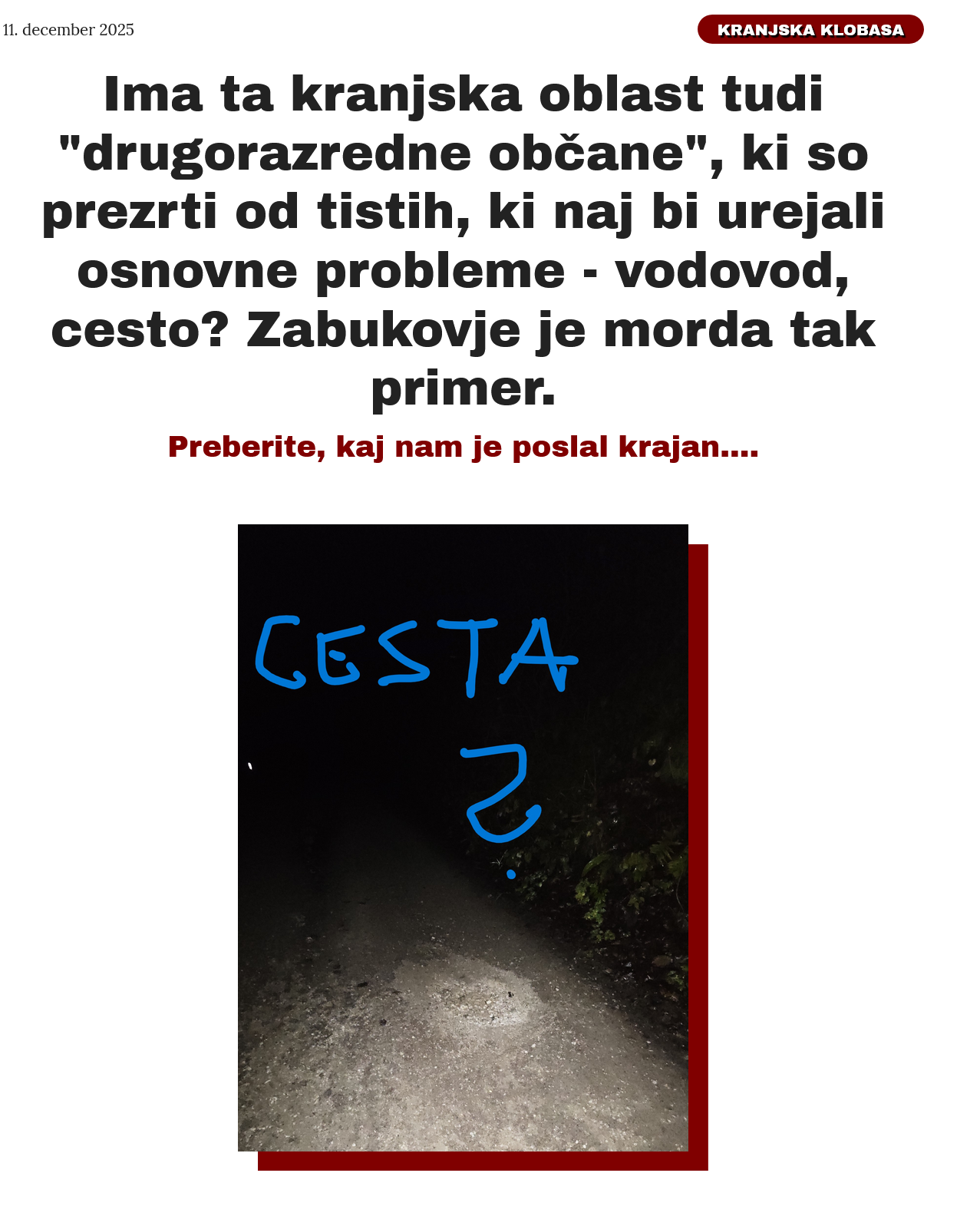 Tole smo zapisali ob opozorilu krajana Zabukovja na katastrofalno stanje ceste na posameznih delih. Potem nas je presenetilo obvestilo, da so po naši objavi vendarle vsaj pripeljali pesek, da bodo cesto uredili. Še letos in kdo?NAPREJ SMO POMISLILI, DA JE Z ZAMUDO UKREPAL MIKLAŽ ALI BIL PREHITER BOŽIČEK. ZDAJ UGIBAMO DO KDAJ BO MESTNA OBLAST ZMOGLA VSAJ ZASILNO UREDITI CESTIŠČE DO ZABUKOVJA?