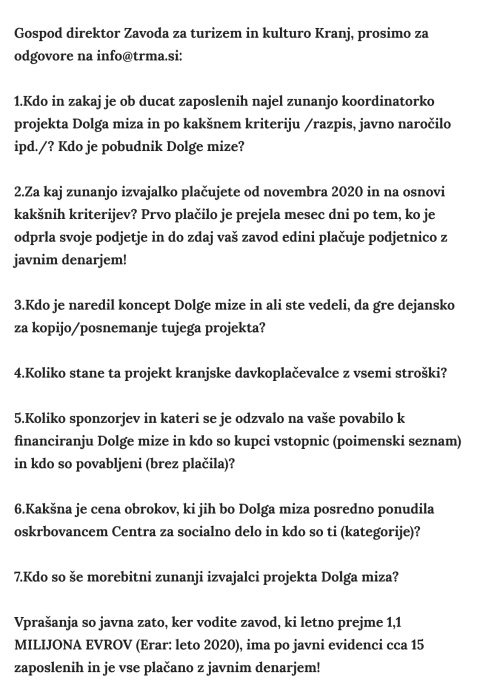 Vprašanja o tem, kako je dejansko potekala "dobrodelna" Dolga miza smo javno objavili. In jih v ponedeljek osebno naslovili na direktorja Klemena Malovrha, ki vodi Zavod za turizem in kulturo Kranj - letno prejmejo 1,1 milijona evrov davkoplačevalskega denarja.