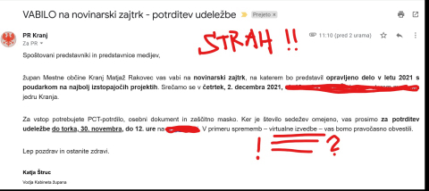 Tudi tole obvestilo je zgovorno, a ga še nismo preverili - ga pa bomo skušali! In zato smo hvaležni, ker nam zaupate probleme in opozarjate na nepravilnosti. Kajti: v tem primeru gre za javno ustanovo, javni denar in....POTEM SMO RES NA PREŽI!