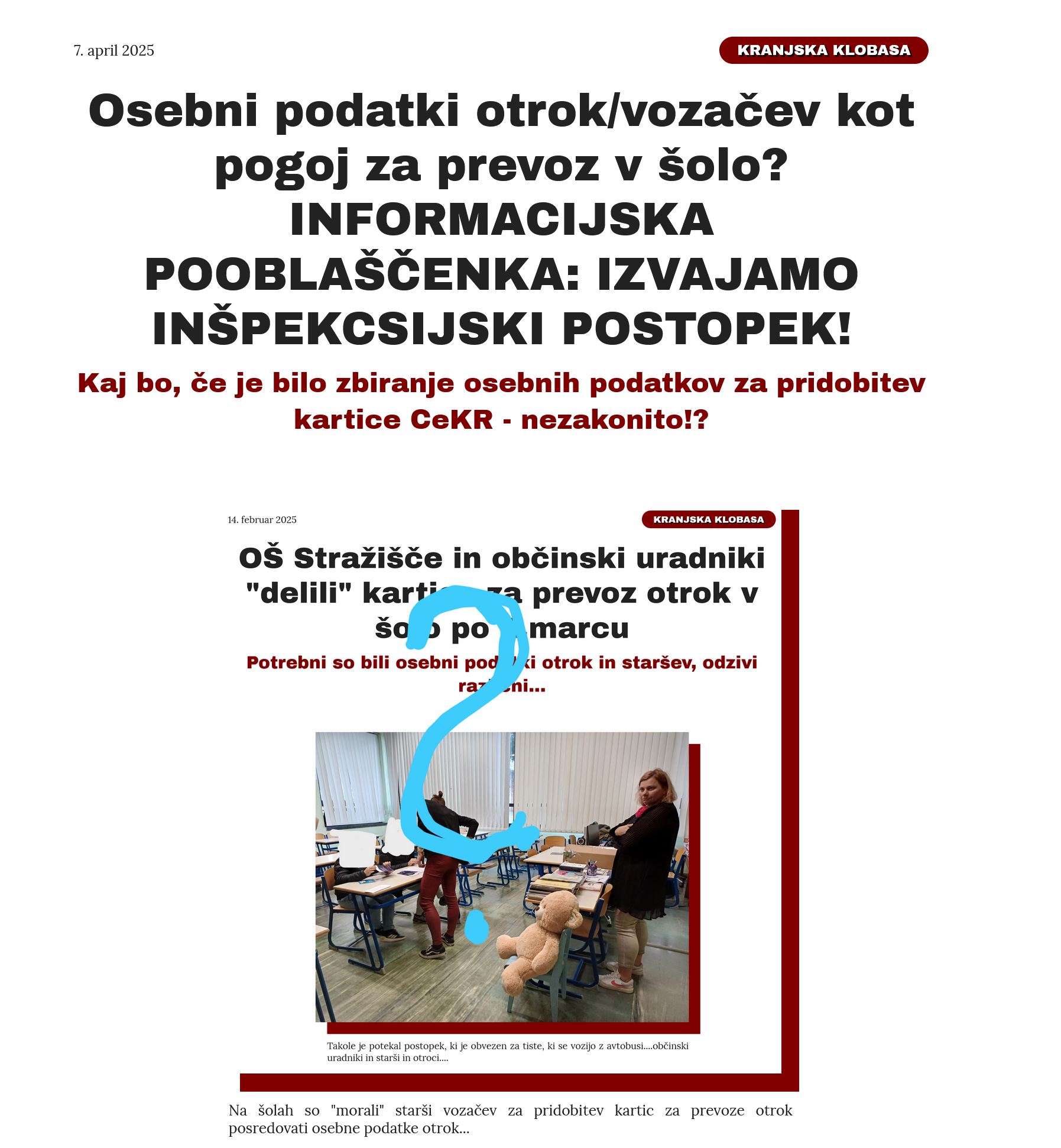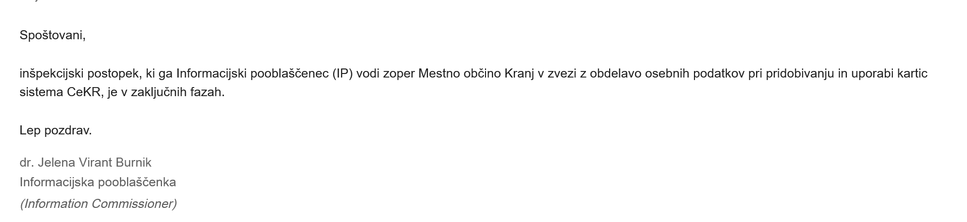 Inšpekcijski postopek glede zajemanja /zahteva šole oziroma občine/ osebnih podatkov otrok in staršev za pridobitev Cekr je torej v zaključnih fazah.
