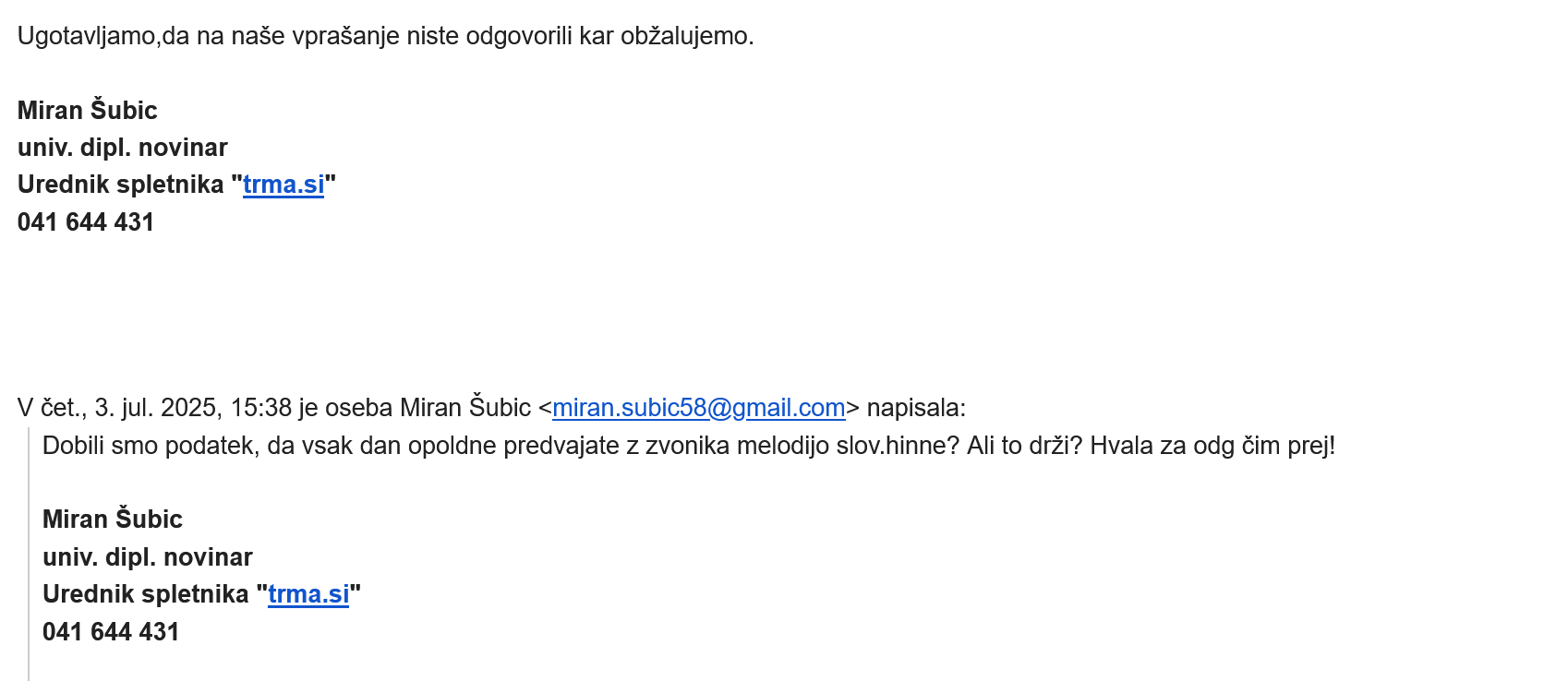 Spoštovani. Morda se spomnite, da sem vas enkrat že spraševala o predvajanju slovenske himne iz cerkvenega zvonika v Kranju. Modra sem prezrla vaš odgovor, za kar se opravičujem. Danes sem ponovno slišala melodijo himne ob pol dvanajstih. Prebrala sem člene iz zakona o predvajanju himne in nisem zasledila, da bi bilo to dovoljeno. Hvala za odgovor in lep pozdrav.
