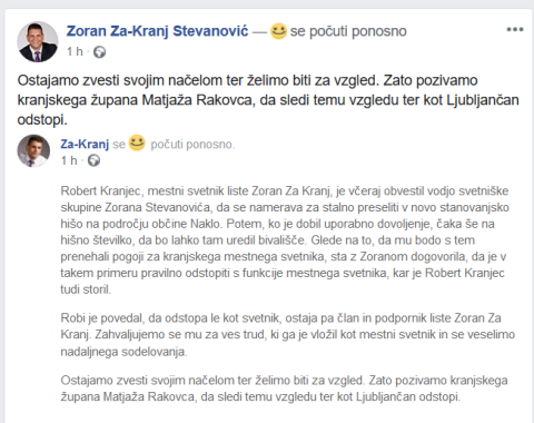 Z odstopom mestnega svetnika Roberta Kranjca smo zaključili zgodbo, ki je se začela v oktobru, novembru. Takrat smo prvič povprašali tudi Zorana Stevanovića (Zoran za Kranj) o statusu svetnika njegove liste. Stik z Robertom Kranjcem smo vzpostavili telefonsko - pogovor je začel on, ob naših vprašanjih pa je slušalko predal Zoranu Stevanoviću, ki je govoril namesto njega. Od takrat do danes - prosto po preedsedniku svetniške skupine oziroma njegovi objavi - pa jim (politični) zgled ni bil toliko v ospredju, da bi zadevo javno in transparentno uredili na začetku. Poudarjamo, da smo pozive k objavi resnice prejeli tudi iz Nakla, sosedje na Kokrici pa so nam tudi zatrdili, da ga tam že nekaj mesecev ni, ko smo zgodbo nadaljevali zadnje mesece. Vmes pa smo bili opozorjeni še na res dokaj pogoste objave zasebnih podatkov s strani Kranjca samega (revije in splet so prinašali reklamne zgodbe o tem ali onem izdelku, vsi pa so bili vezani na novo hišo kjer...). To pišemo zato, ker bi vsaka drugačna interpretacija seveda lahko kazala na našo gonjo ali preganjanje Roberta Kranjca kot lokalnega politika. Seveda pa smo opravili tudi vsa novinarska poizvedovanja - tako pri skakalcu/svetniku kot pri predsedniku in članih svetniške skupine. Odgovorov nismo prejeli in v odmoru med sejo sveta MOK smo ponovno za pojasnilo prosili tudi svetnika. Opozoril nas je, da moramo varovati njegovo zasebno/družinsko življenje. Kako ga je varoval sam, zadošča minuta "guglanja", mi pa smo dosledno ščitili tiste, ki jih v takem primeru ne zajema kriterij javnih osebnosti. Zaključek podajamo zato, ker so minili najmanj štirje meseci našega iskanja resnice. VSE JE BILO POTRJENO Z ODSTOPOM ROBERTA KRANJCA IN JAVNIM ZAPISOM ZORANA STEVANOVIĆA. VSE ZAKLJUČKE PREPUŠČAMO BRALKAM IN BRALCEM TRME!