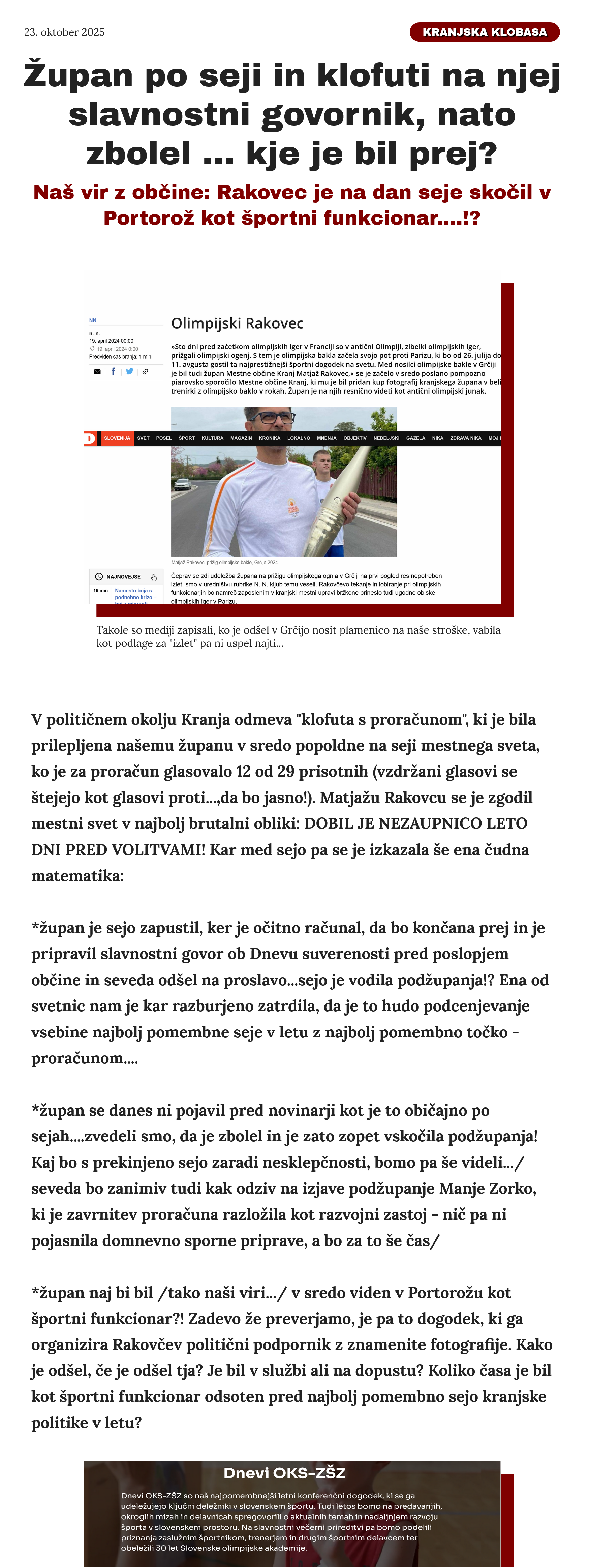 Tole pa je del naše objave kjer se sprašujemo na podlagi našega vira, kje je bil župan na dan seje? SPRAŠUJEMO IN NE TRDIMO. ČE BI - NA PRIMER - ODGOVOR, DA NI BIL V PORTOROŽU PREJELI TAKOJ, BI TO DAN KASNEJE, 24.10. OBJAVILI ....TODA NE: NA OBČINI SO Z ODGOVOROM POČAKALI DO IZTEKA ZAKONSKEGA ROKA, NAM PA POSLALI POPRAVEK, KI SMO GA SKLADNO Z ZAKONOM OBJAVILI 29.10., PREJELI PA SMO GA TAKRAT, KO SMO ČAKALI NA ODGOVOR...TOREJ NEKAJ DNI PREJ!?