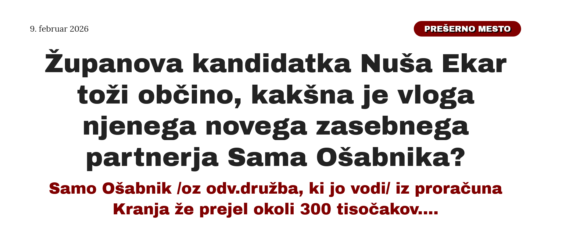 Odvetnik Samo Ošabnik je (novi) zasebni partner Nuše Ekar, ki toži MO Kranj, ker ni bila izbrana za direktorico Prešernovega gledališča. Formalno jo zastopa odvetnica Perčičeva s katero sta prijateljici - vsi trije z njenim partnerjem (živita skupaj) pa so bili sošolci. Ker obenem odvetniška družba solastnika Ošabnika nemoteno izdaja račune za svoje storitve MO Kranj in zlasti Zavodu za turizem Kranj, smo o tem dobili odgovore od župana in direktorja, ne pa od gospoda Ošabnika. Nič narobe: to je njegova pravica.