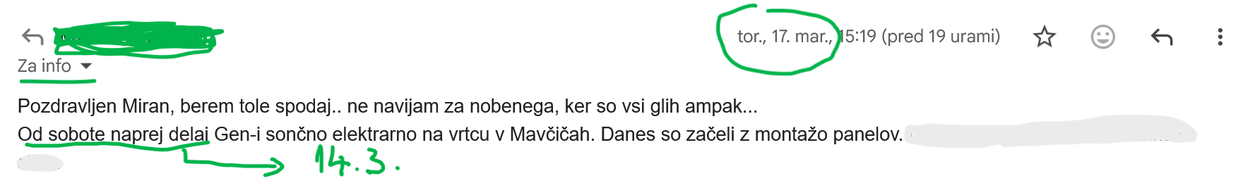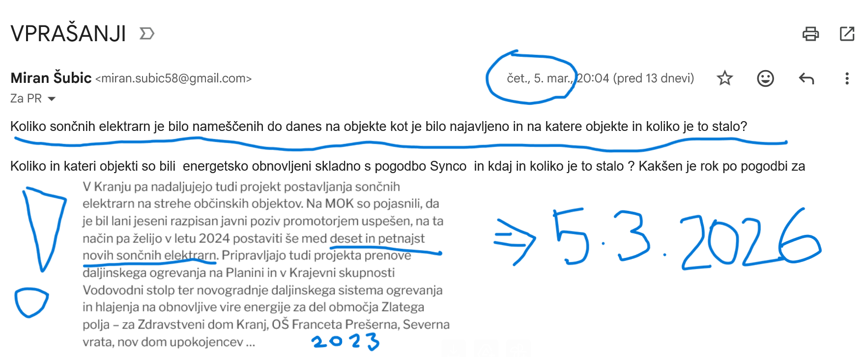 Tole smo MOK vprašali 5.3. ob dejstvu, da so bile (8-15) sončne elektrarne najavljene leta 2023, 2024 naj bi že bile na strehah javnih objektov - A NE DELUJE ŠE NITI ENA, DVE STA NAMEŠČENI, ENO PA SO ZAČELI NAMEŠČATI (POGLEJTE SPODAJ)...