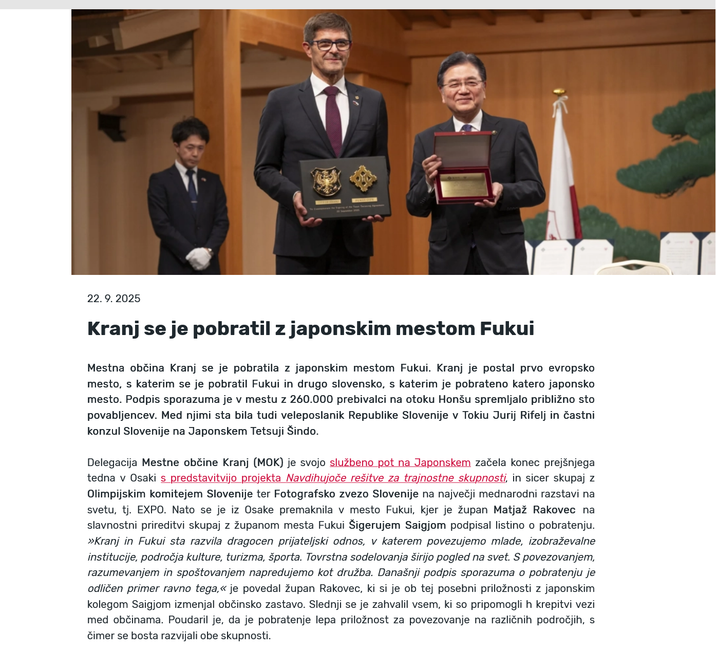 Odgovor Mestne občine Kranj: Podpis sporazuma o pobratenju z mestom Fukui sta župana Kranja in Fukuija podpisala 22. septembra v Fukuiju. Podpisa se je udeležilo približno 100 gostov, med njimi tudi veleposlanik Republike Slovenije v Tokiu Jurij Rifelj in častni konzul Slovenije na Japonskem Tecuji Šindo. Dogodek se je slavnostno začel s plesno predstavo, sledil je kratek pregled dosedanjega sodelovanja obeh mest, podpis pogodbe in nagovori.