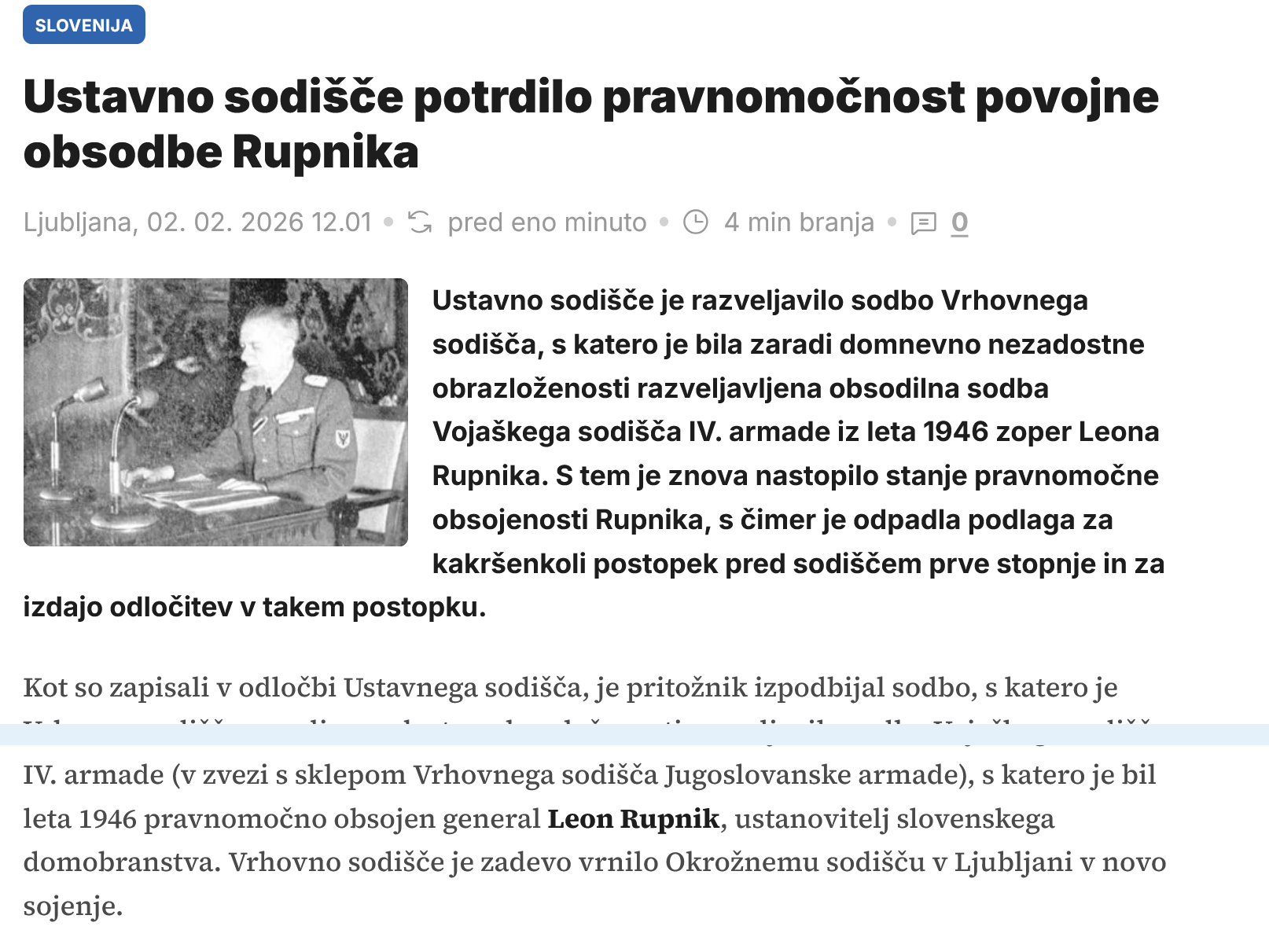 Mnogi so bili po vojni (tudi to so dejstva) pobiti brez sodb, to je temno poglavje naše zgodovine po partizanski zmagi. A to ne spremeni zdaj jasne presoje o izdajalcu in izdaji, ki jo je zagrešil sivolasi mož z brado in iztegnjeno roko, ki je bila znak strinjanja z okupatorjem in podpore tistim, ki so hoteli iztrebiti slovenski narod. Uprli s(m)o se z orožjem in porazili okupatorje in domače izdajalce. To je bistvo, to je podlaga, to je srž in sodba ustavnega sodišča je logična posledica tega.