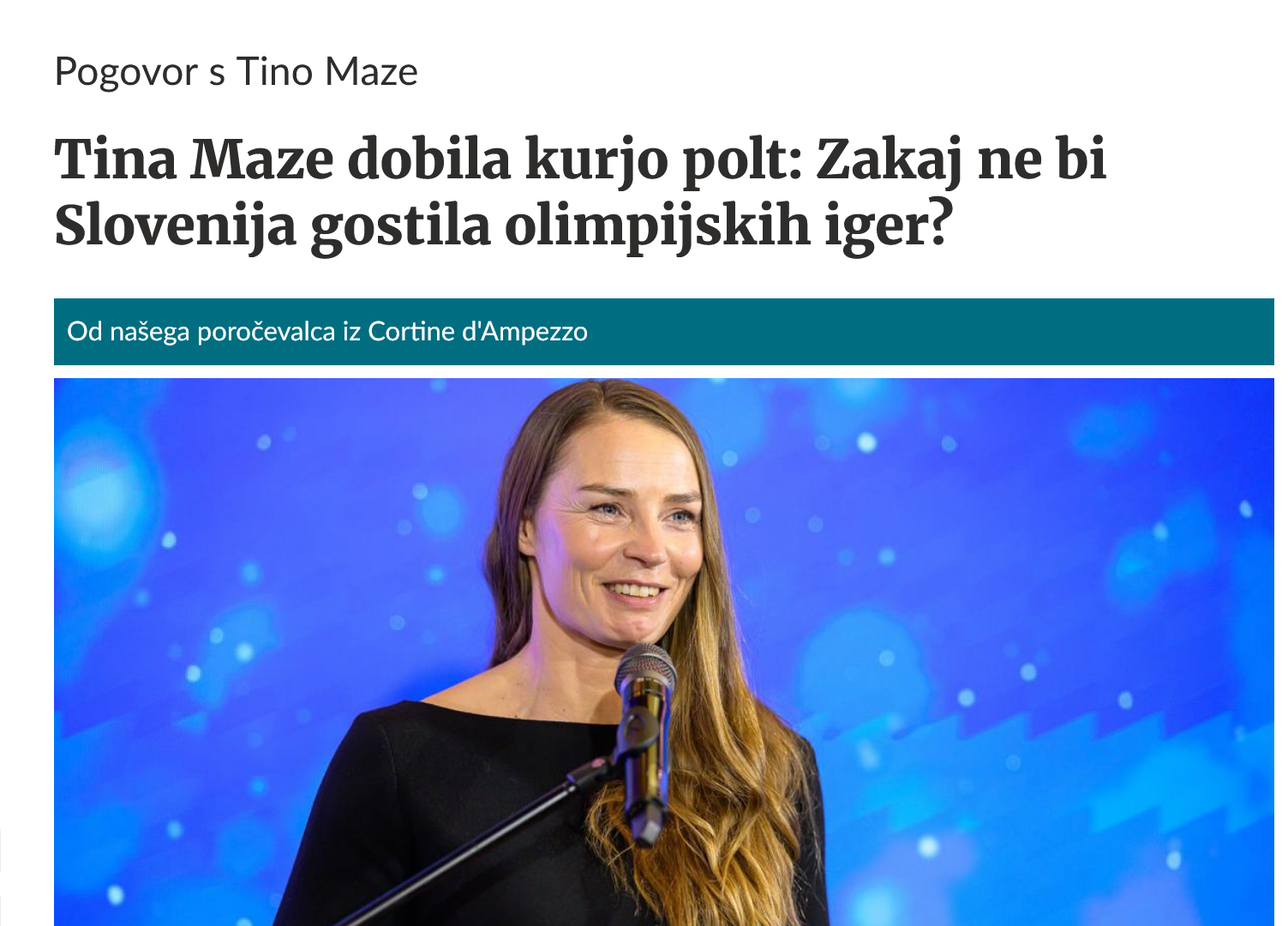 Vesel in ponosen sem, da živim v dobi športnice Tine Maze. Njeni dosežki so neizbrisen dokaz slovenskega športa. Danes Tina ne tekmuje več, je pa strokovna komentatorka Eurosporta, uglednega mednarodnega športnega programa. O tem, da živi v Italiji in del časa tudi v Cortini kjer so zdaj zimske olimpijske igre, ne bi razglabljal: njena stvar....