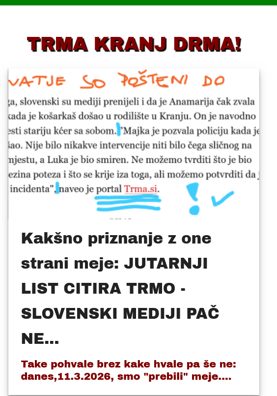 Seveda pa novinar, ki ima .... ne klone kar tako. Bolje zapisano: dela dalje. Po svoje, tudi z napakami in še čem. Zanesljivo pa ne po žaljah ali diktatu ali pričakovanjih kogarkoli. Najmanj lokalnega politika, ki je prišel in bo prej ali slej odšel. Medij Trma bo na spletu ostal - živ ali kot spomin. Zato me je seveda v teh dneh znova prepričala tujina: hrvaški res velik in vpliven portal je brez zadržka citiral Trmo, navedel vir, bil do nas tak kot se za profesionalce spodobi. Priznanje, da ni boljšega, večjega ? Ne, sem pa - tako mi je rekel prijatelj - "prvi na svetu objavil..." Res je: pa naj se sliši in bere še bolj smešno, tako je bilo, Tega si ne dam vzeti, ker je res.